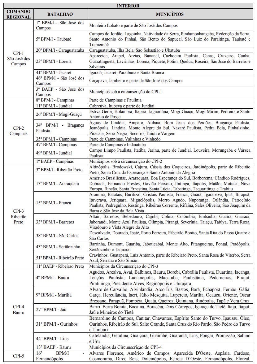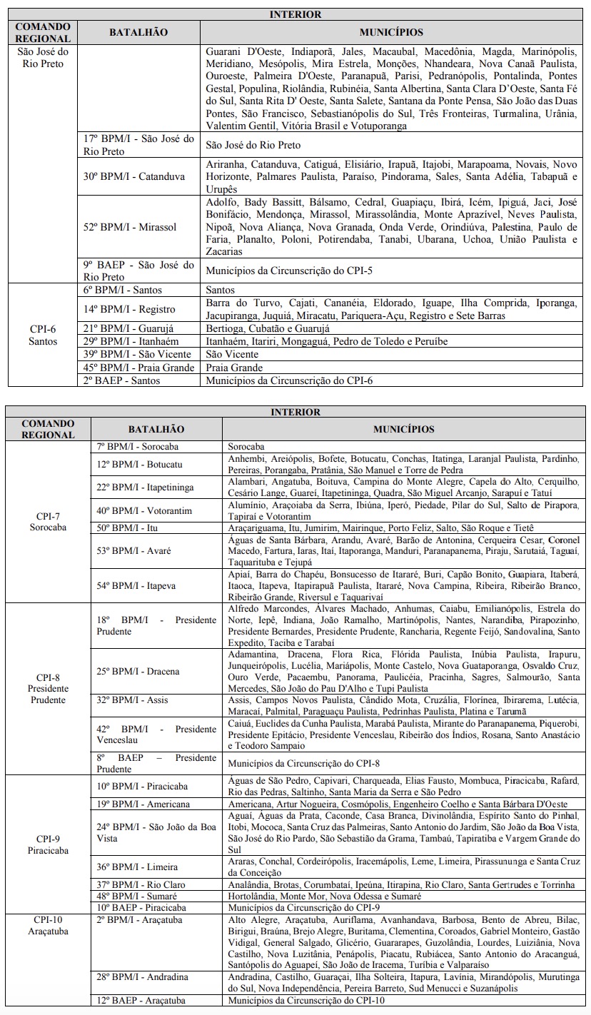 Artigo 7º - Ao CPC - Cel PM Hermínio subordinam-se os seguintes Comandos de Policiamento de Área Metropolitana, para o exercício das atividades de polícia ostensiva e de preservação da ordem pública, em suas respectivas circunscrições, adiante especificadas: