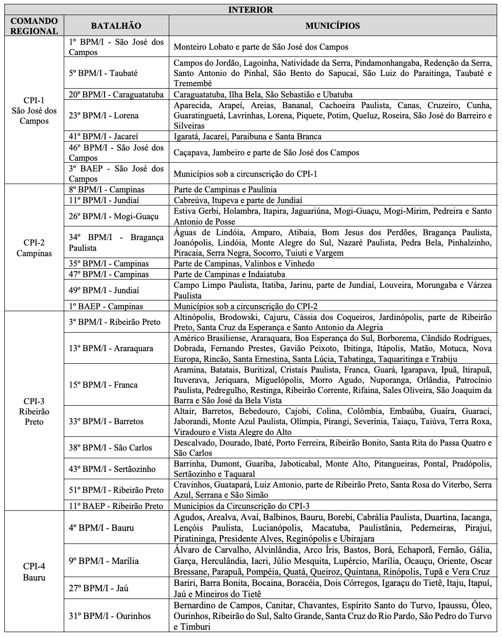 f) Comando de Policiamento do Interior-4 (CPI-4), sediado em Bauru: Região Administrativa de Bauru e parte da Região Administrativa de Marília;