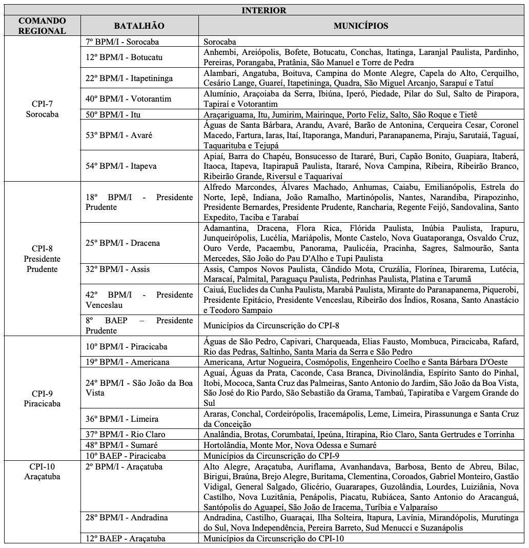 i) Comando de Policiamento do Interior-7 (CPI-7), sediado em Sorocaba: Região Administrativa de Sorocaba, Região Metropolitana de Sorocaba e parte da Região Administrativa de Itapeva;