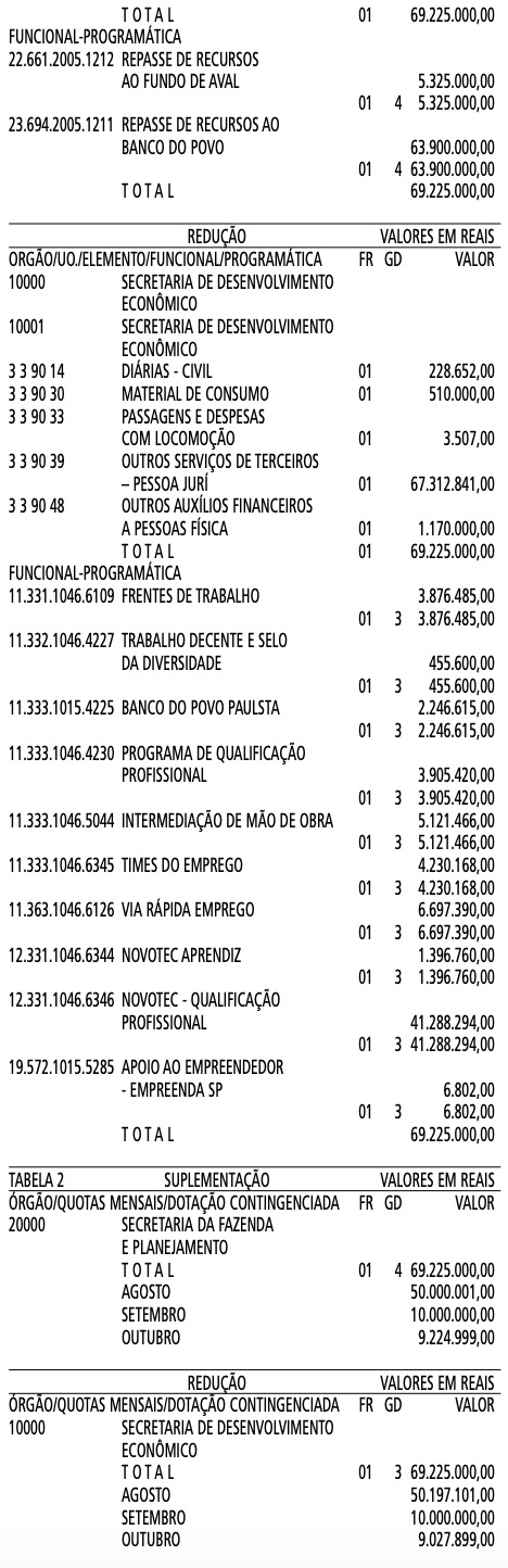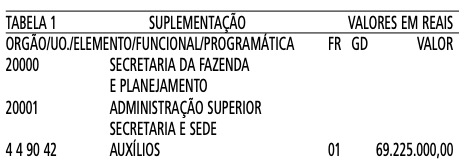 Artigo 1º - Fica aberto um crédito de R$ 69.225.000,00 (Sessenta e nove milhões, duzentos e vinte e cinco mil reais), suplementar ao orçamento da Secretaria da Fazenda e Planejamento, observando-se as classificações Institucional, Econômica, Funcional e Programática, conforme a Tabela 1, anexa.