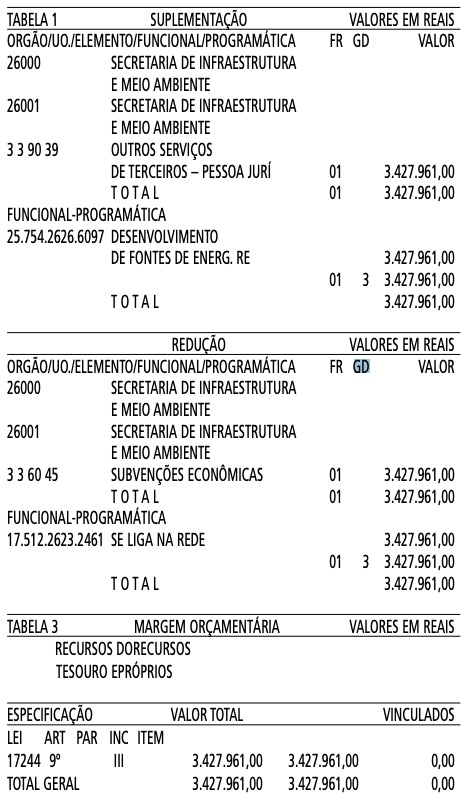 Artigo 1º - Fica aberto um crédito de R$ 3.427.961,00 (Três milhões, quatrocentos e vinte e sete mil, novecentos e sessenta e um reais), suplementar ao orçamento da Secretaria de Infraestrutura e Meio Ambiente, observando-se as classificações Institucional, Econômica, Funcional e Programática, conforme a Tabela 1, anexa.