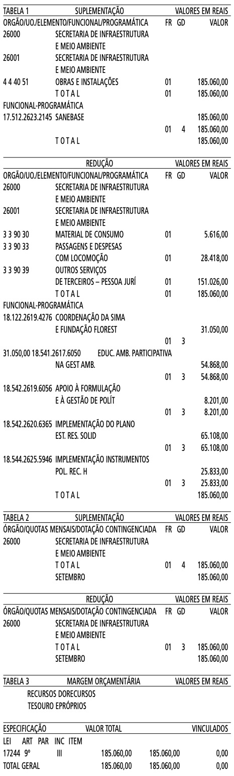 Artigo 1º - Fica aberto um crédito de R$ 185.060,00 (Cento e oitenta e cinco mil, sessenta reais), suplementar ao orçamento da Secretaria de Infraestrutura e Meio Ambiente, observando-se as classificações Institucional, Econômica, Funcional e Programática, conforme a Tabela 1, anexa.