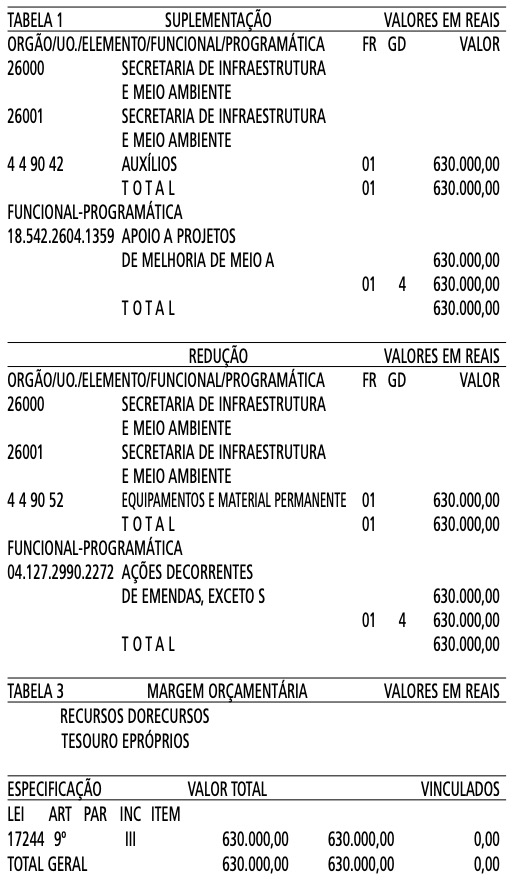 Artigo 1º - Fica aberto um crédito de R$ 630.000,00 (Seiscentos e trinta mil reais), suplementar ao orçamento da Secretaria de Infraestrutura e Meio Ambiente, observando-se as classificações Institucional, Econômica, Funcional e Programática, conforme a Tabela 1, anexa.
