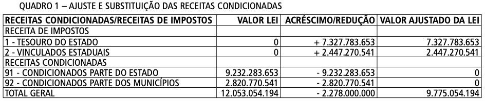 Considerando a determinação do artigo 11 da Lei nº 17.309, de 29 de dezembro de 2020, para que o Poder Executivo providencie a substituição das fontes de recursos condicionadas pelas respectivas fontes definitivas, cujas alterações na legislação tenham sido aprovadas, e cancele as dotações à conta das referidas receitas condicionadas no caso das alterações legislativas propostas não aprovadas ou parcialmente aprovadas;