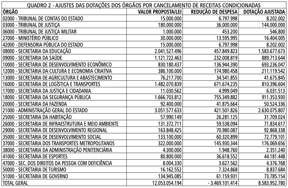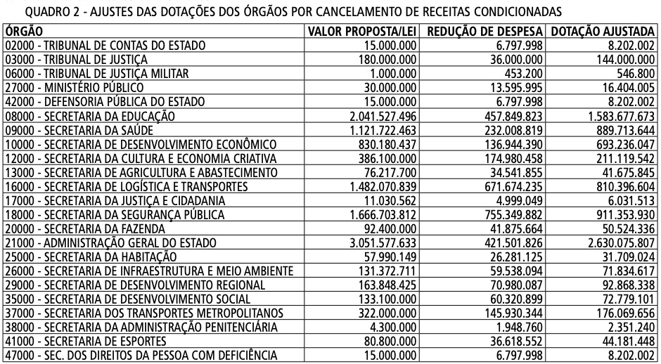 Artigo 2º - Em decorrência das alterações tributárias não aprovadas ou parcialmente aprovadas, as dotações à conta das referidas receitas condicionadas são canceladas no todo ou em parte, conforme o Quadro 2 - Ajustes das Dotações dos Órgãos por Cancelamento de Receitas Condicionadas.