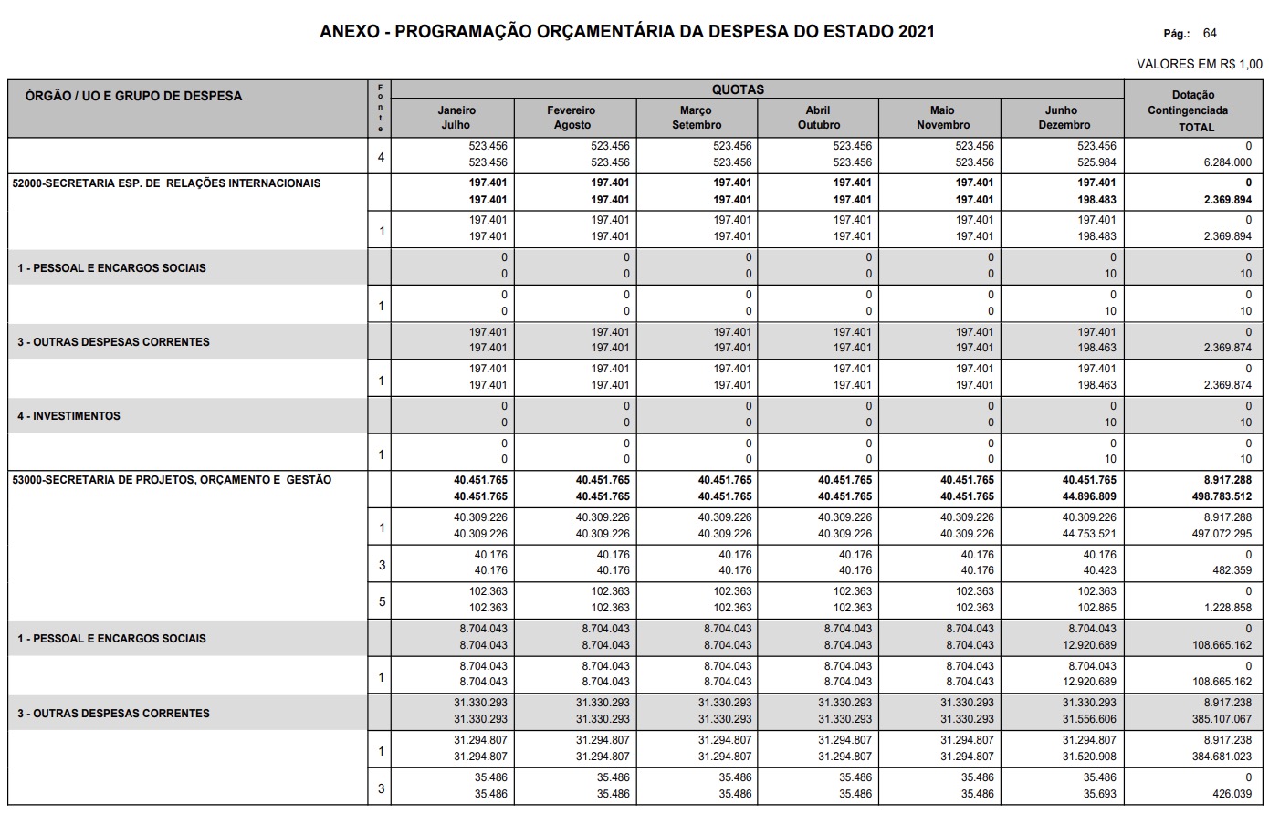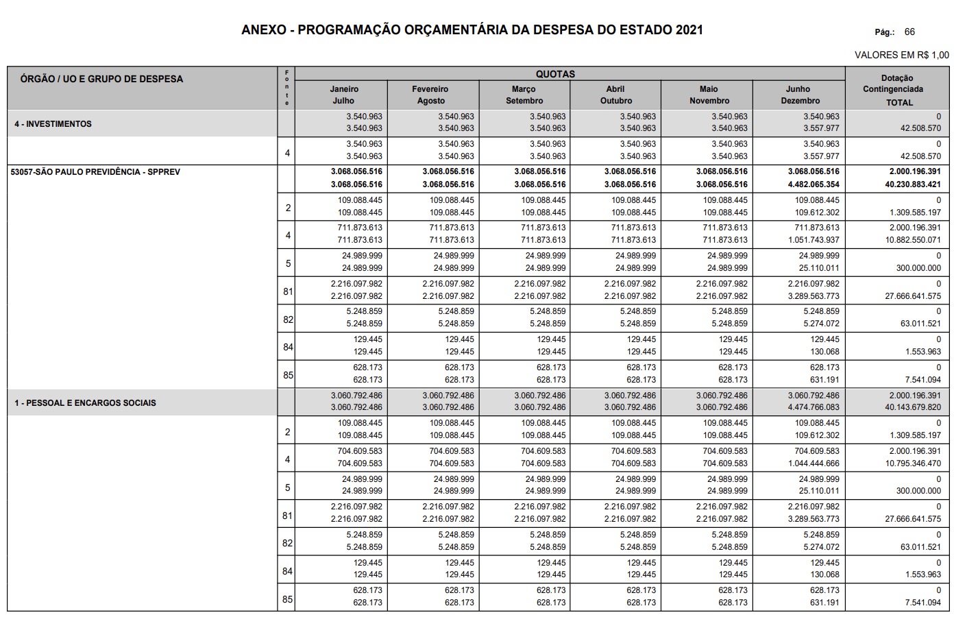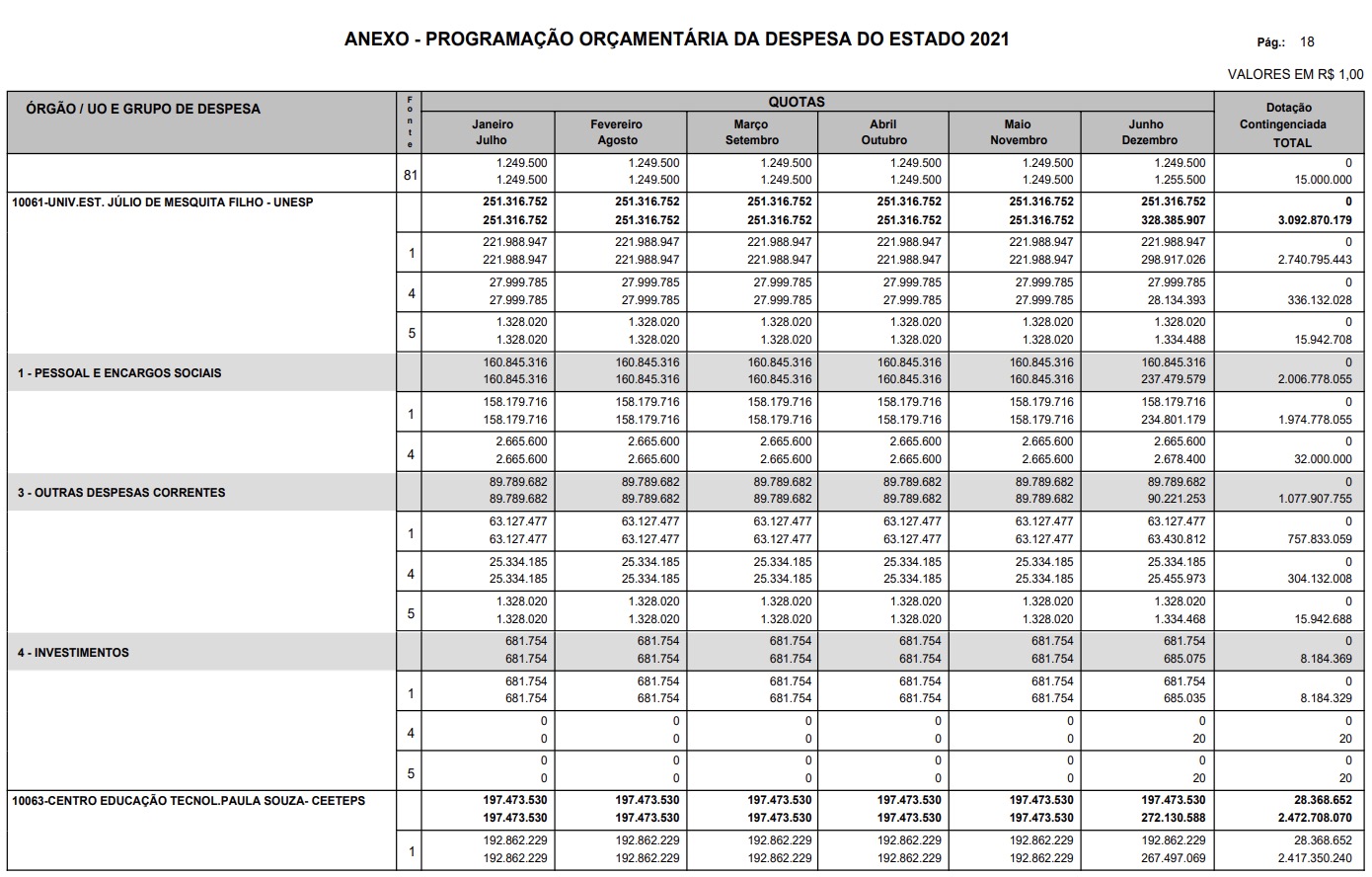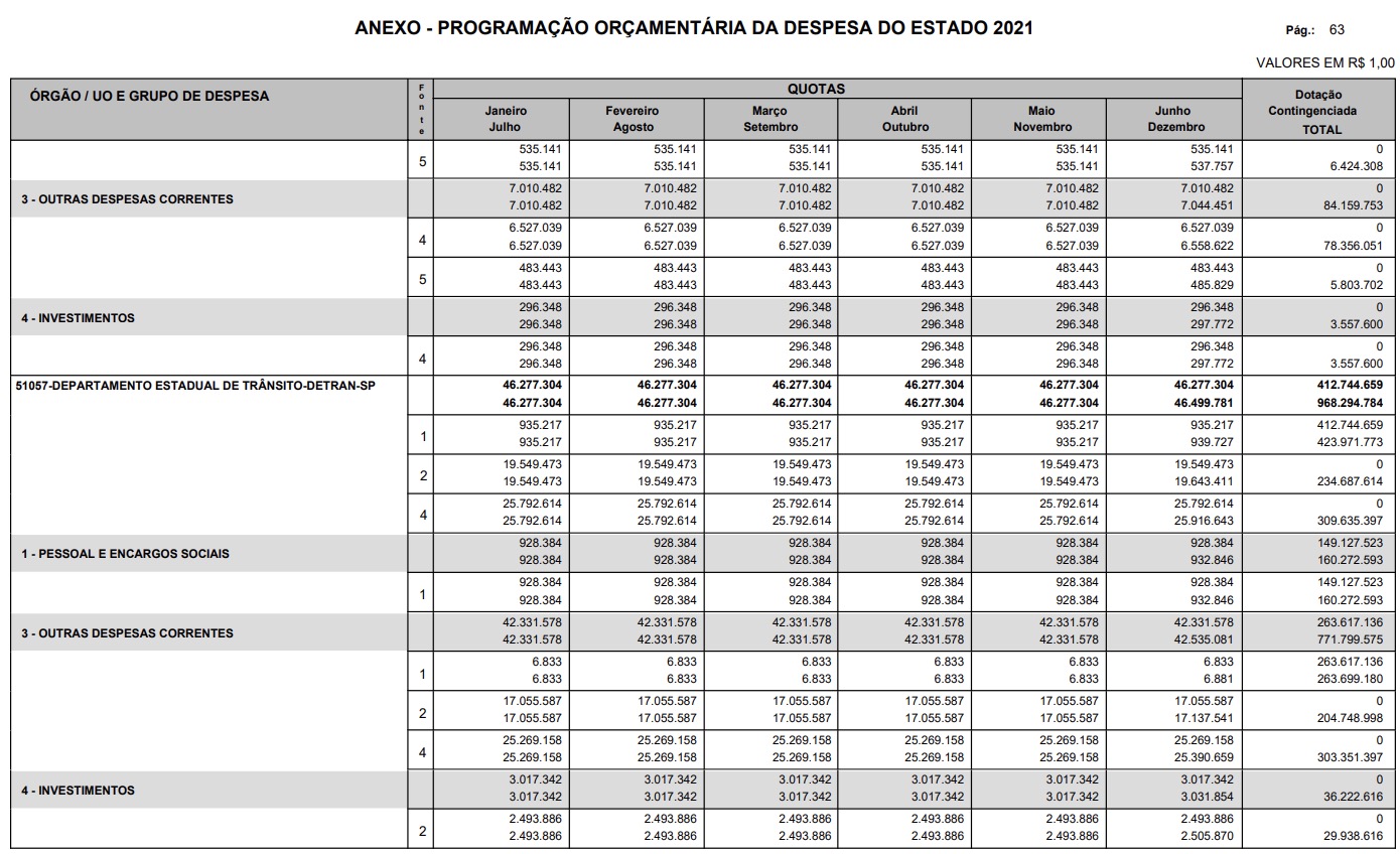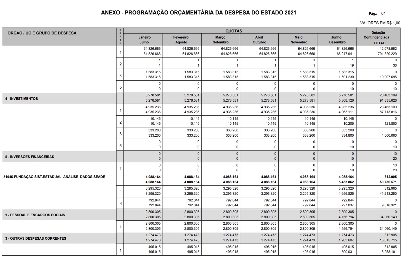 § 1º - A distribuição das dotações orçamentárias, por quotas, constantes do Anexo deste decreto, será automaticamente disponibilizada no SIAFEM/SP com o seguinte detalhamento: