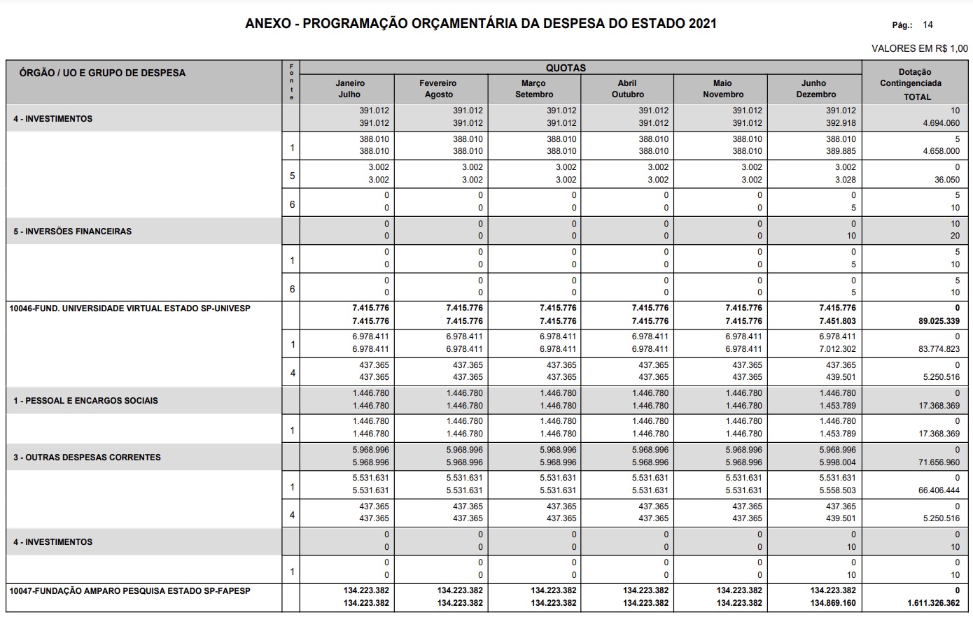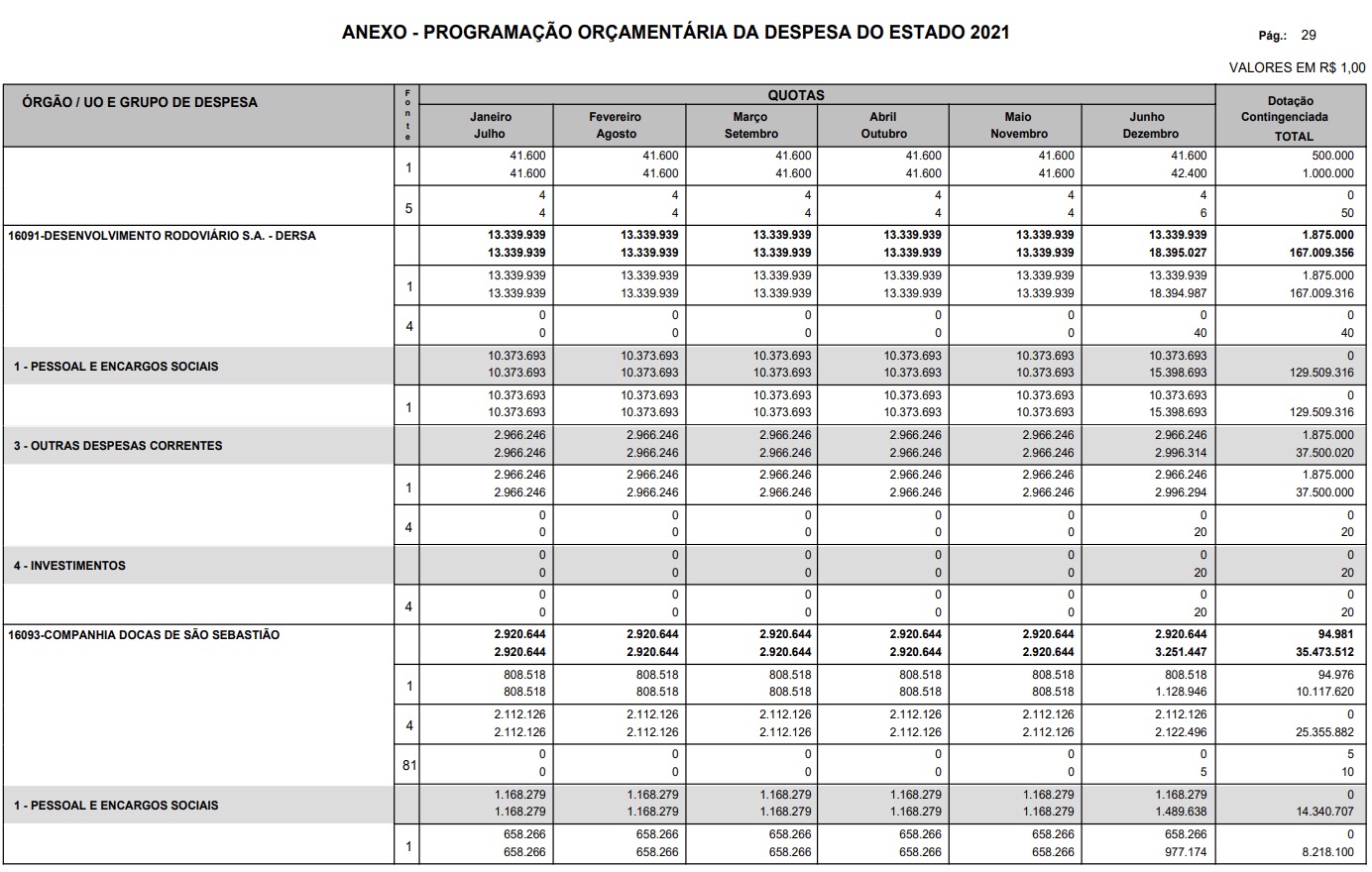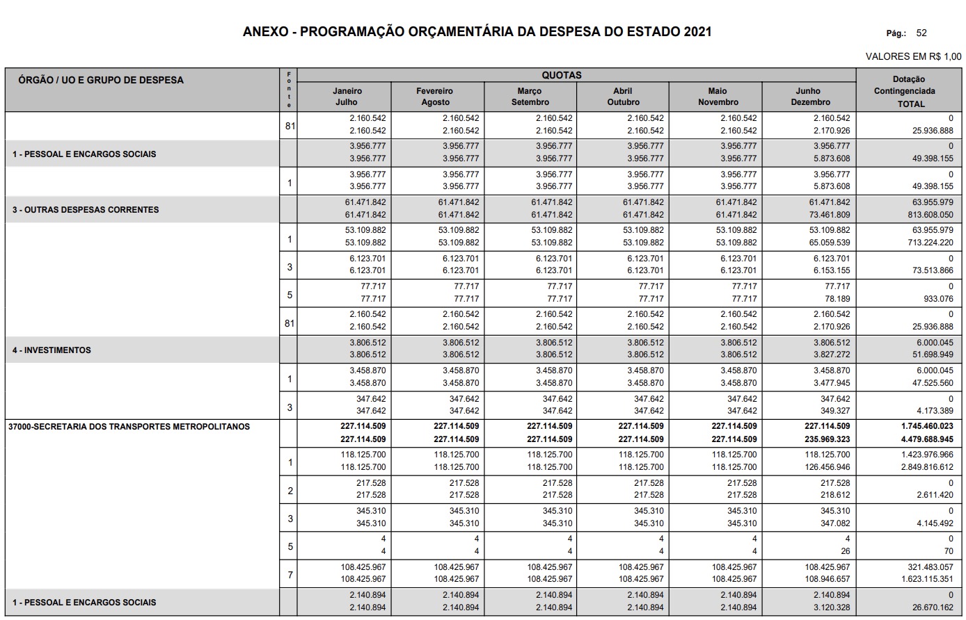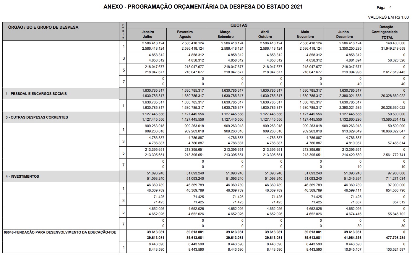 § 1º - A distribuição das dotações orçamentárias, por quotas, constantes do Anexo deste decreto, será automaticamente disponibilizada no SIAFEM/SP com o seguinte detalhamento: