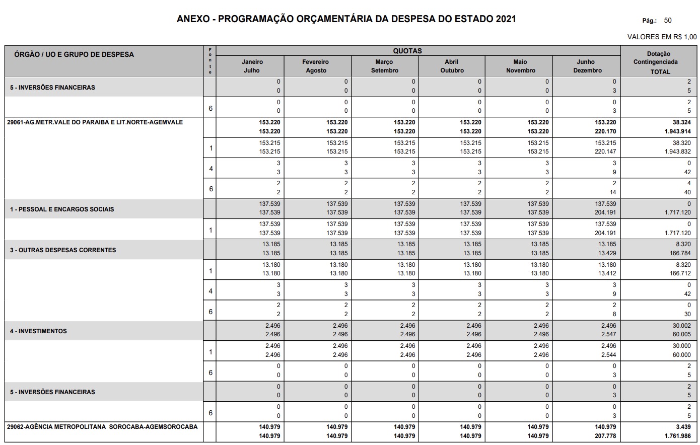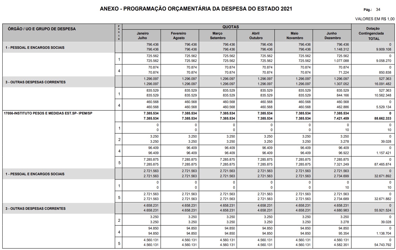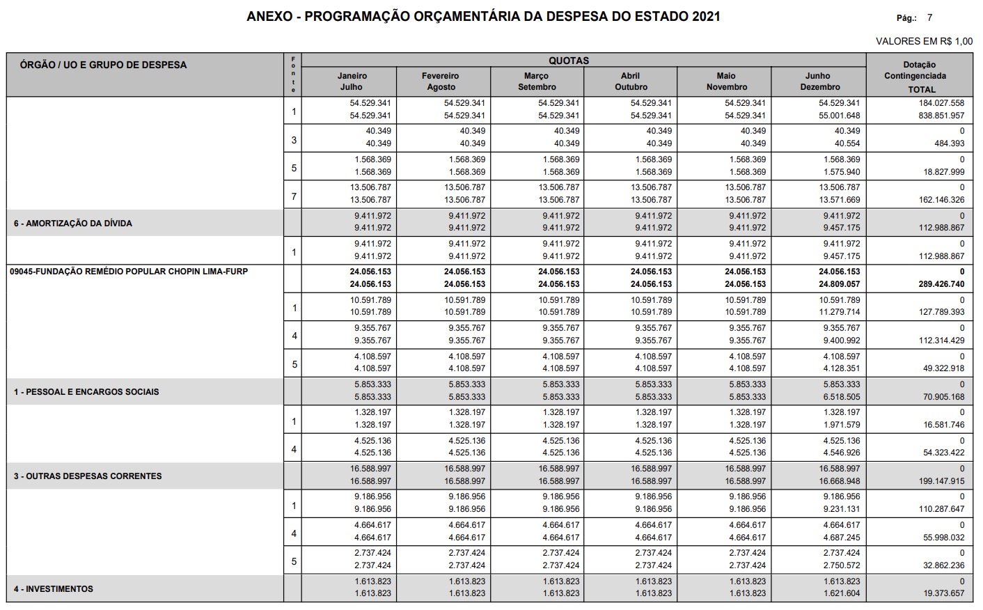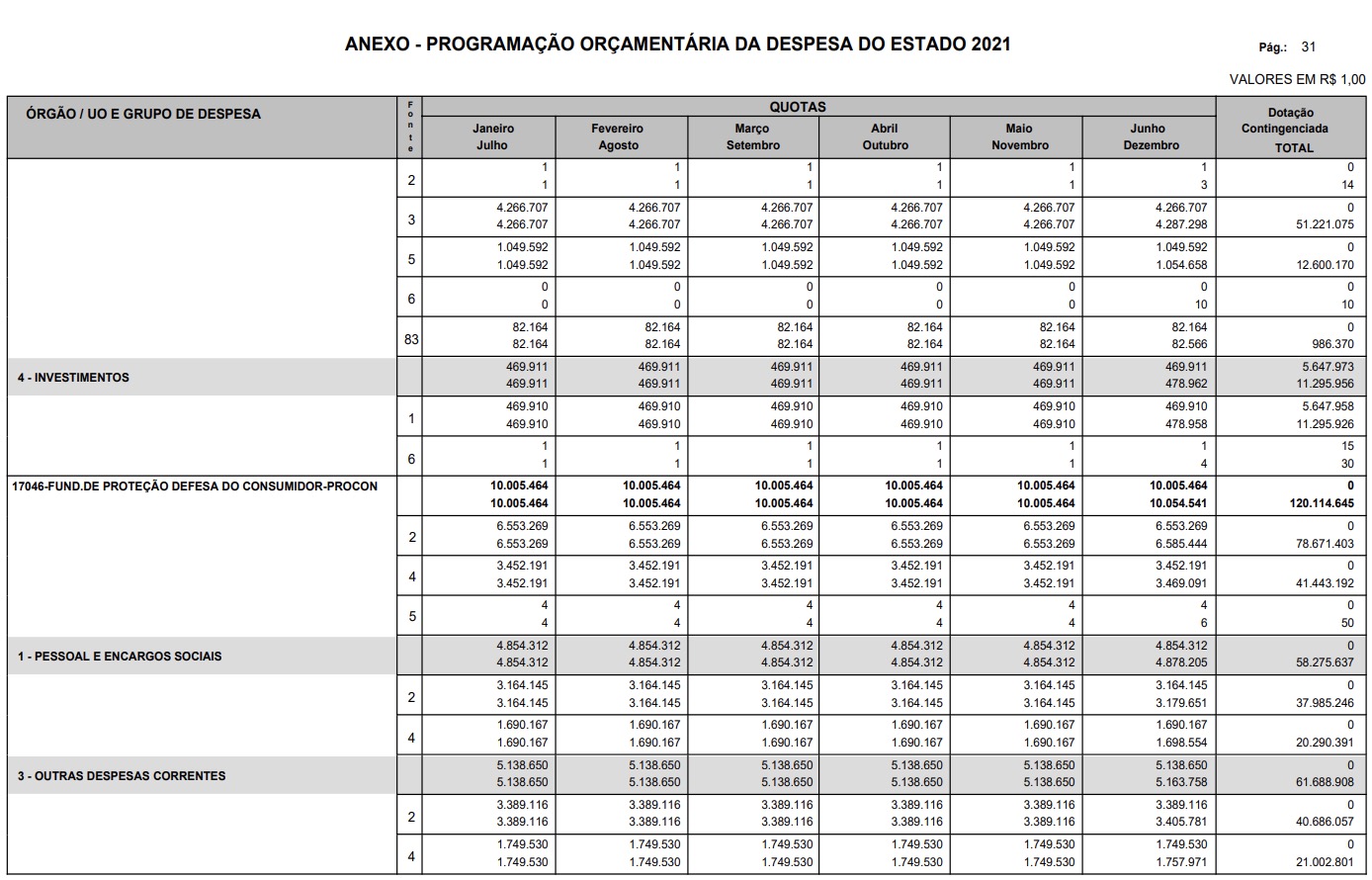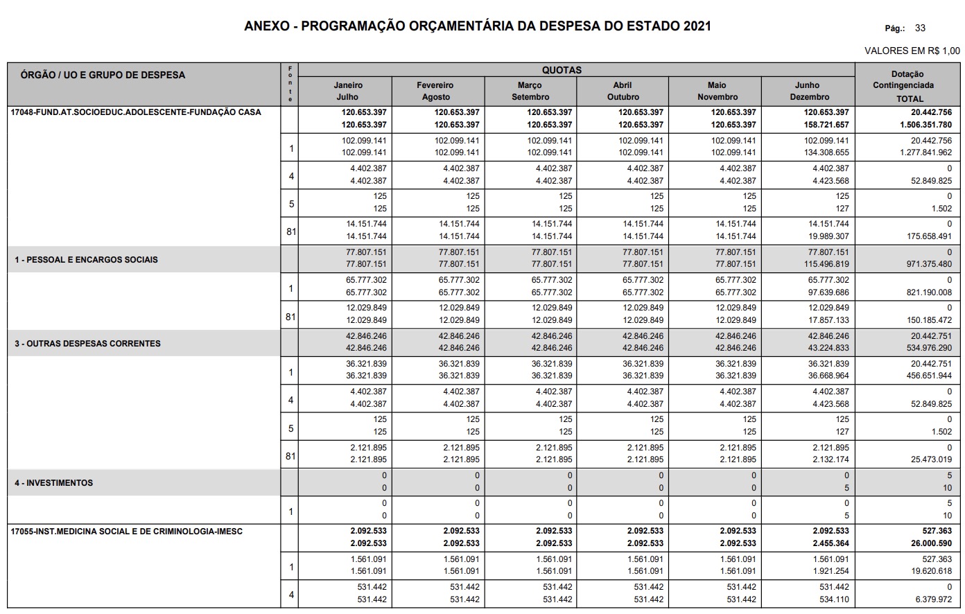 § 1º - A distribuição das dotações orçamentárias, por quotas, constantes do Anexo deste decreto, será automaticamente disponibilizada no SIAFEM/SP com o seguinte detalhamento: