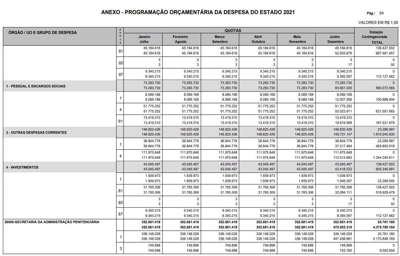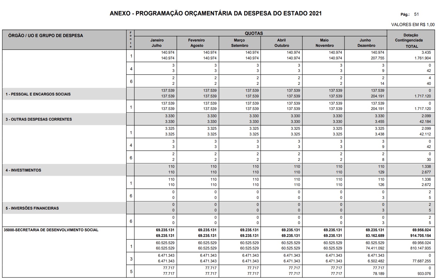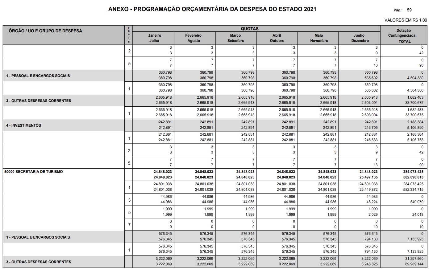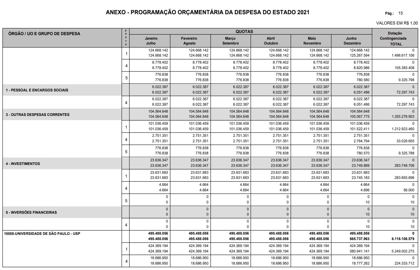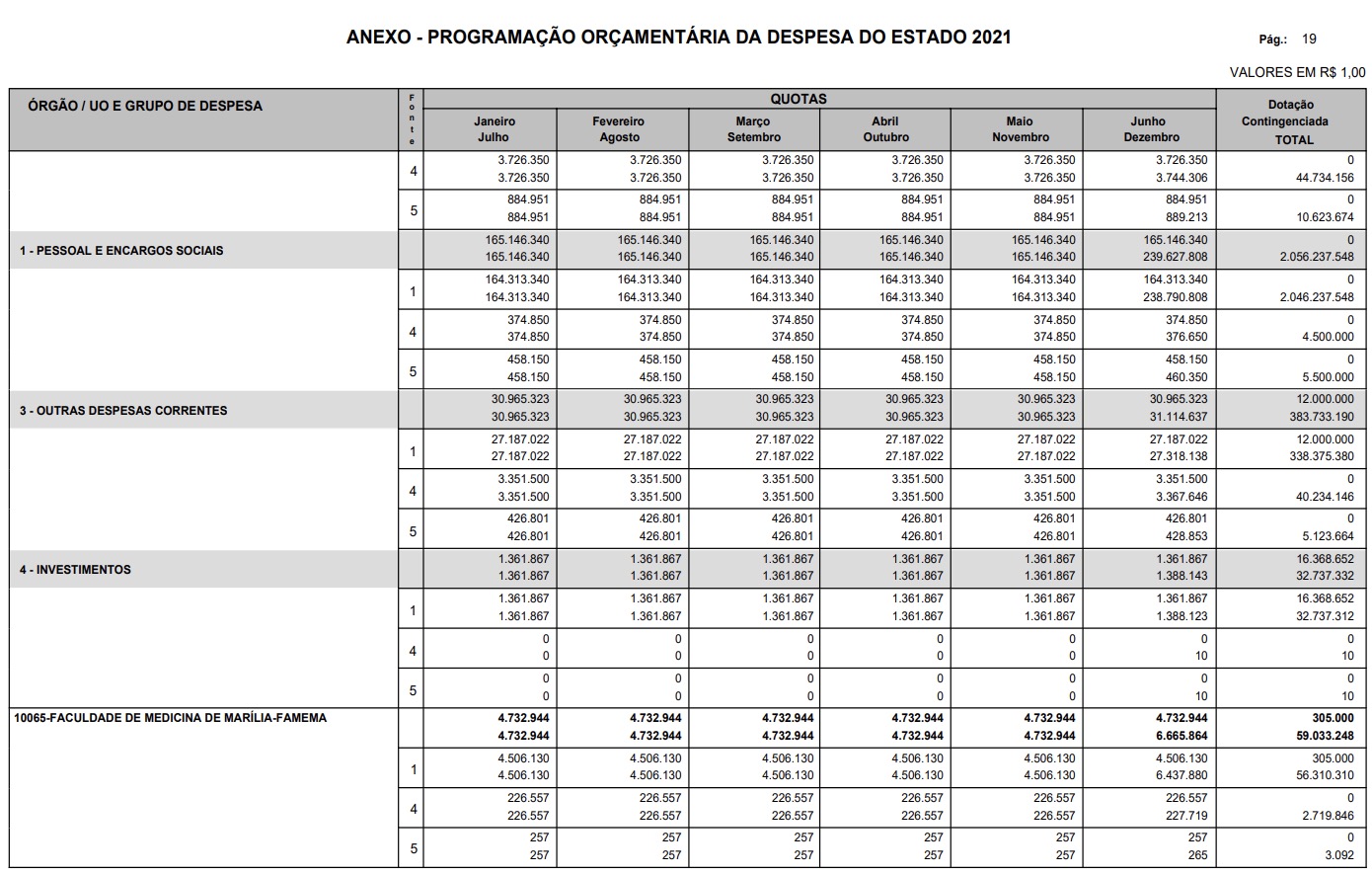 § 1º - A distribuição das dotações orçamentárias, por quotas, constantes do Anexo deste decreto, será automaticamente disponibilizada no SIAFEM/SP com o seguinte detalhamento:
