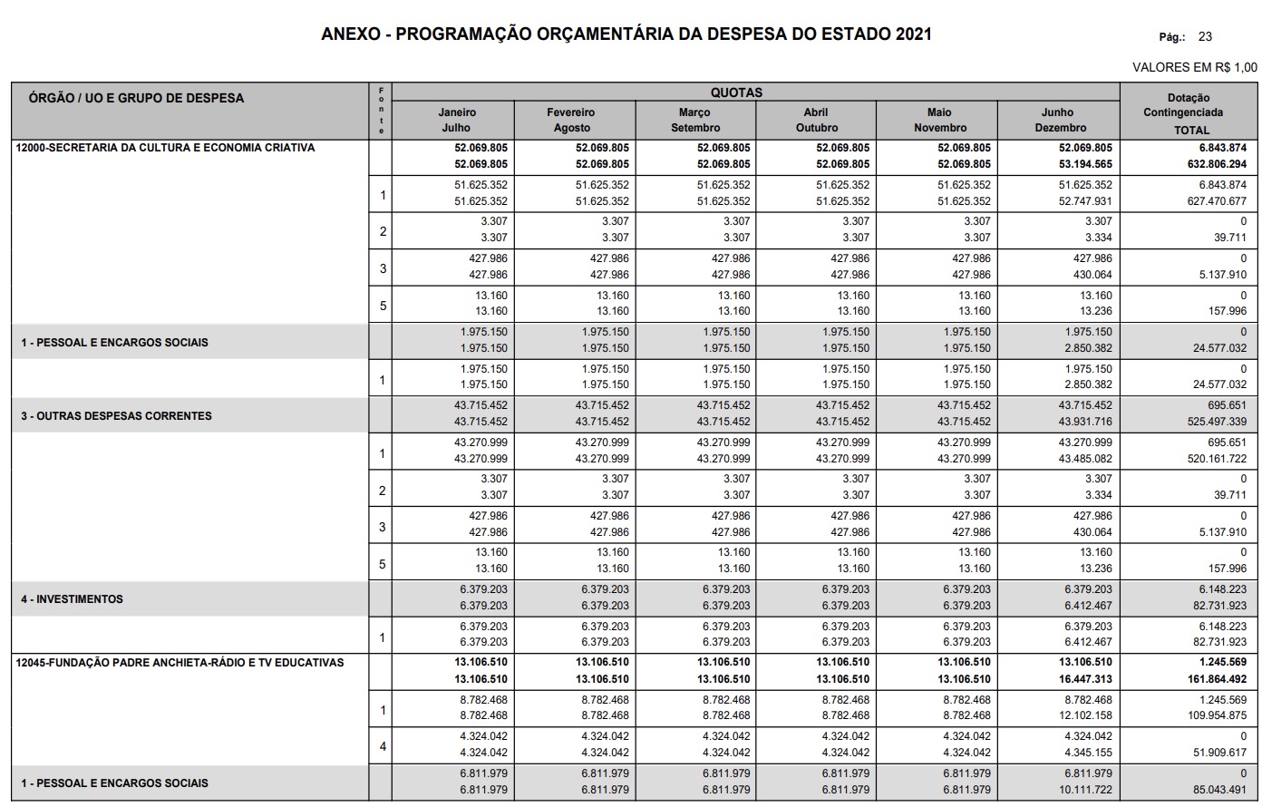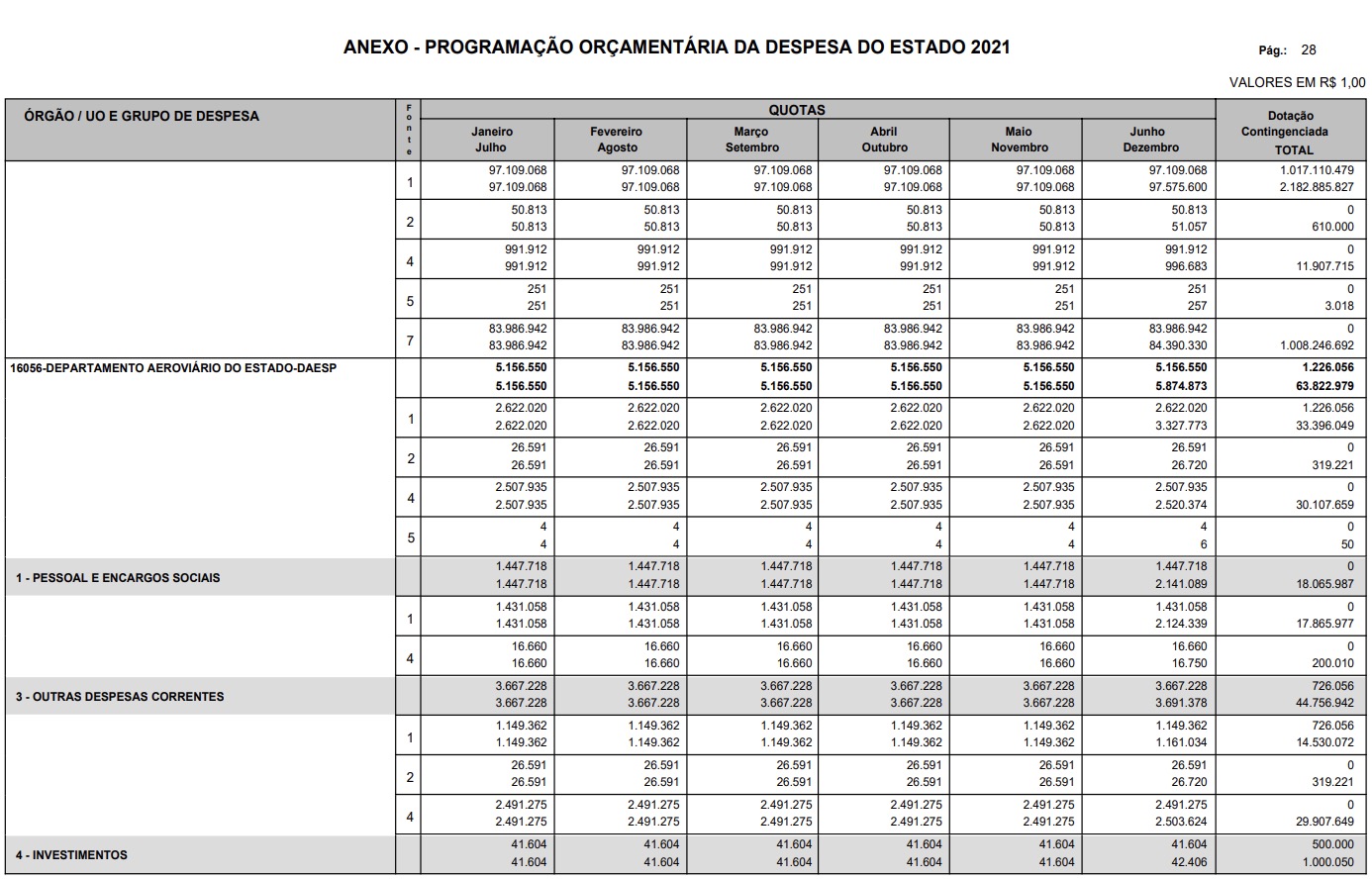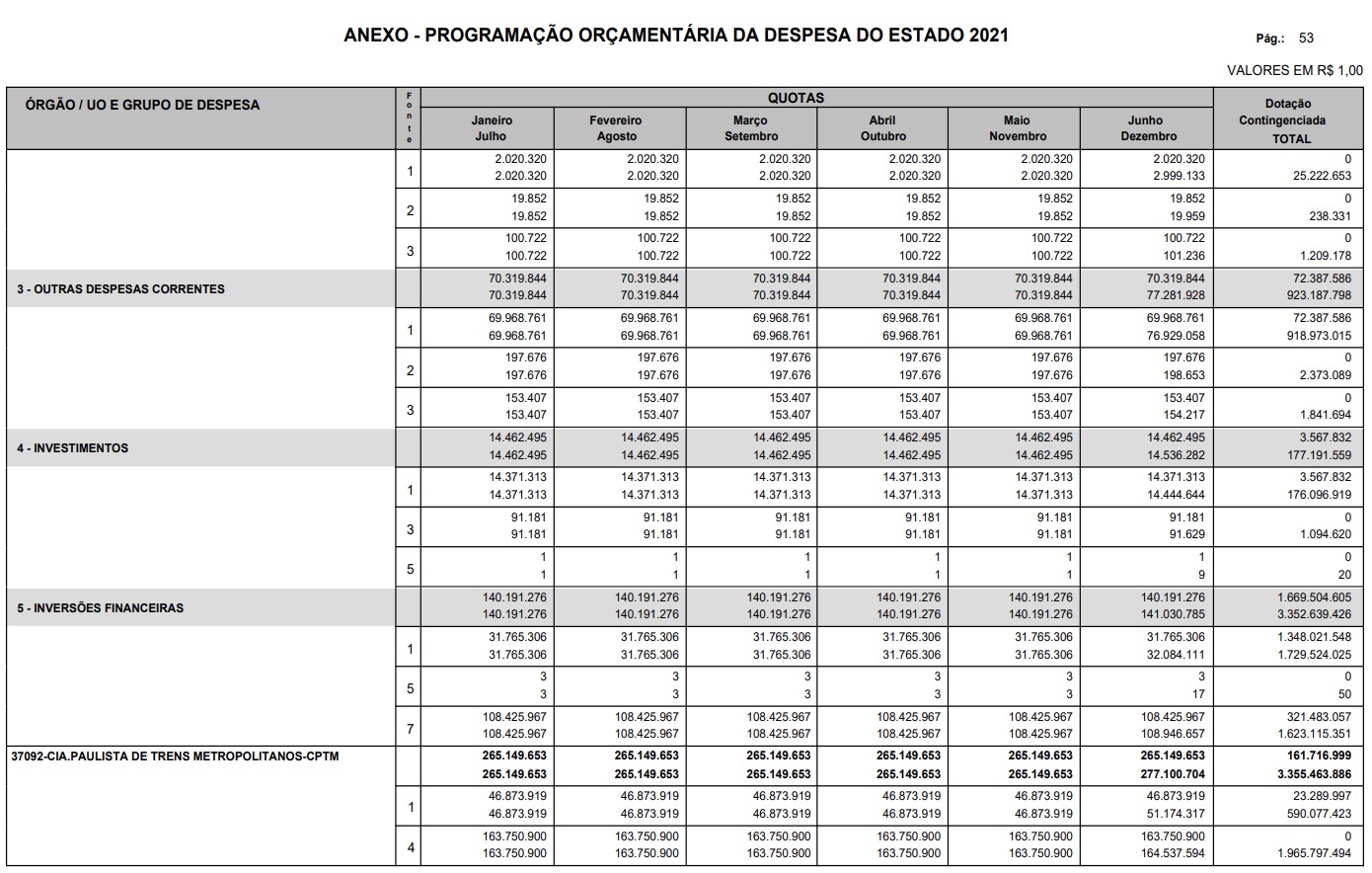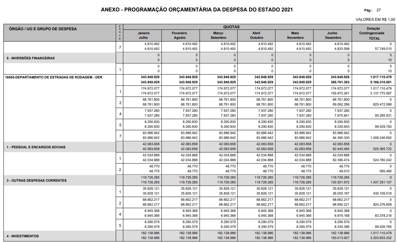 § 1º - A distribuição das dotações orçamentárias, por quotas, constantes do Anexo deste decreto, será automaticamente disponibilizada no SIAFEM/SP com o seguinte detalhamento:
