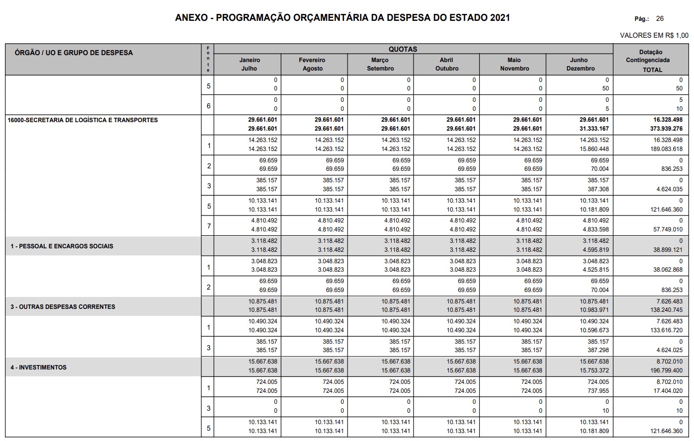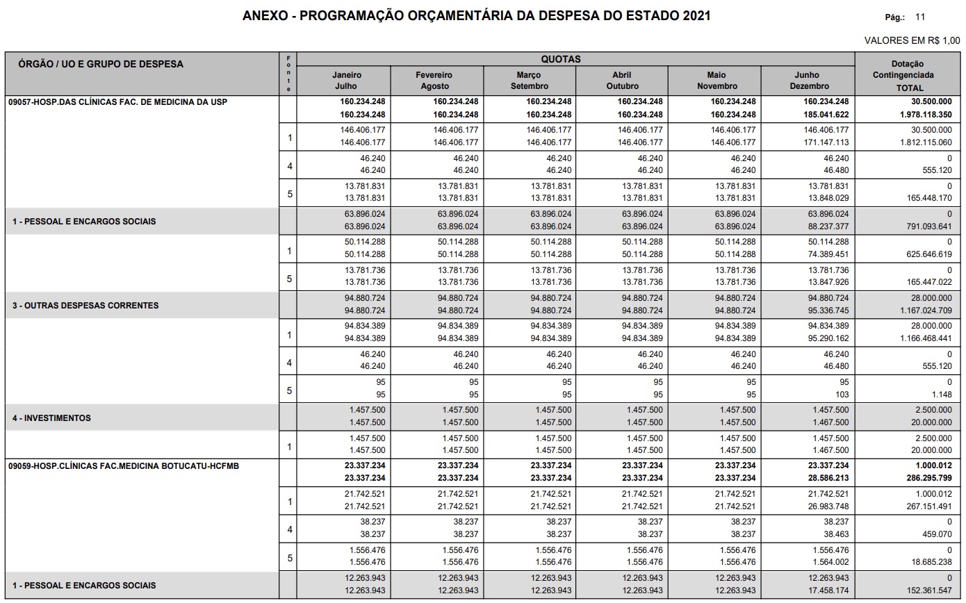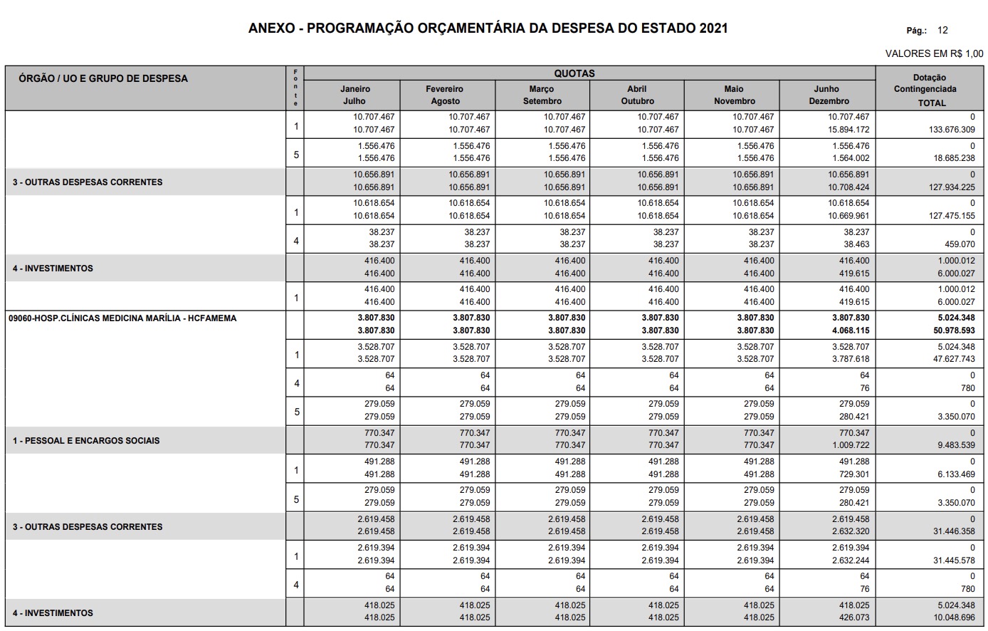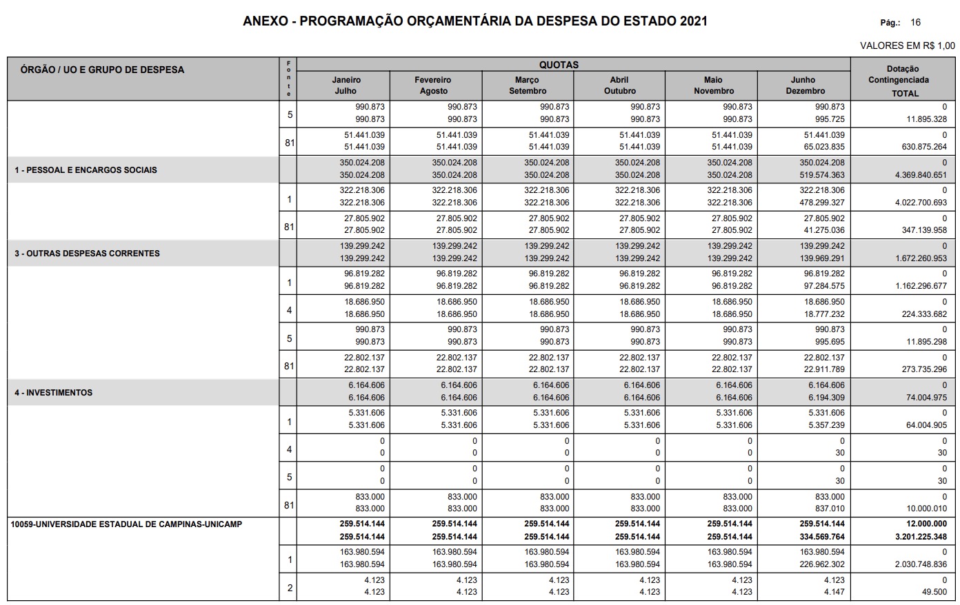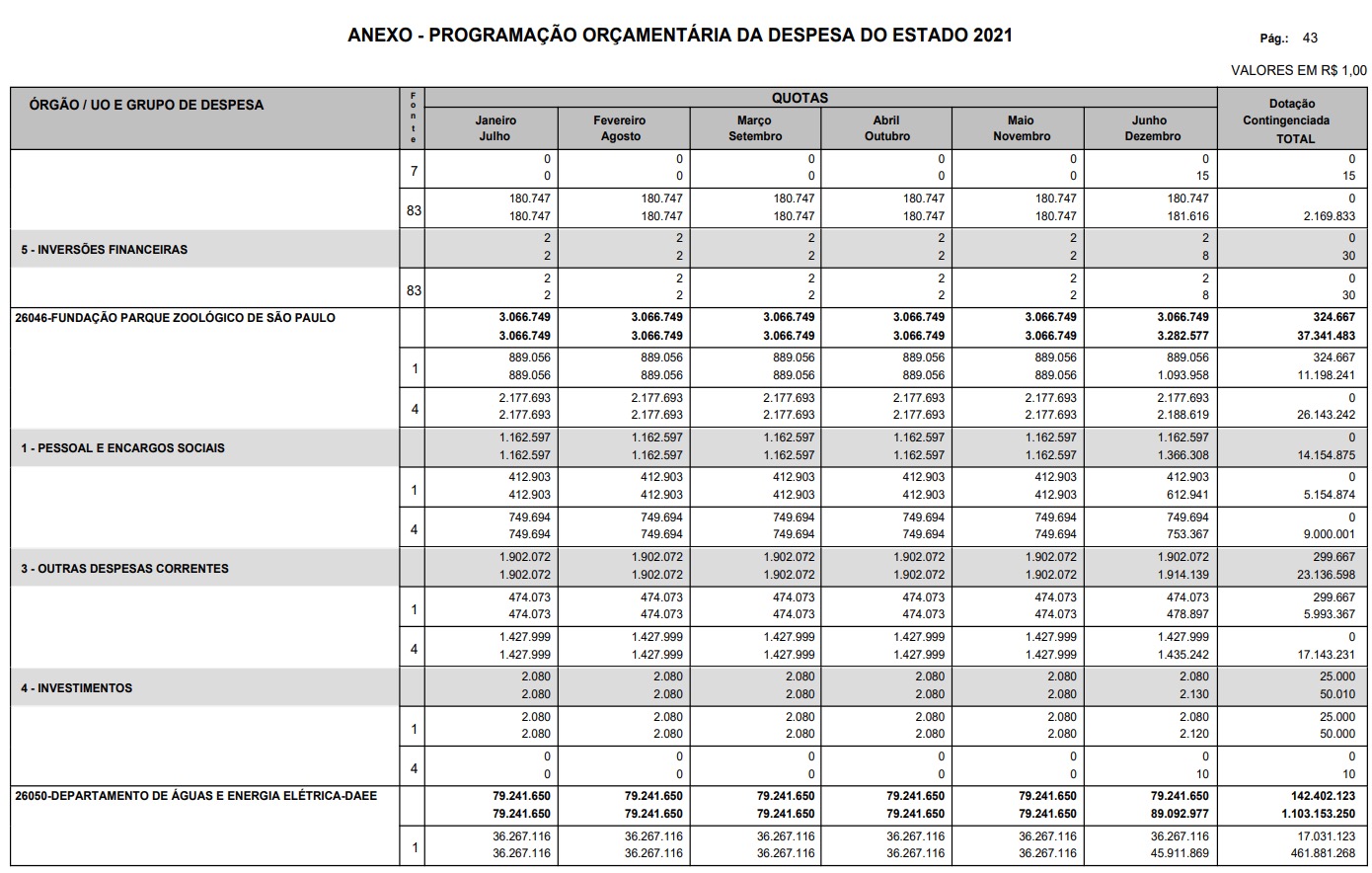 § 1º - A distribuição das dotações orçamentárias, por quotas, constantes do Anexo deste decreto, será automaticamente disponibilizada no SIAFEM/SP com o seguinte detalhamento: