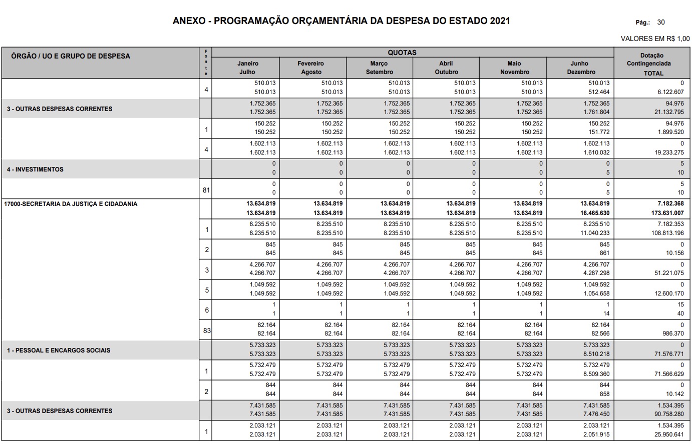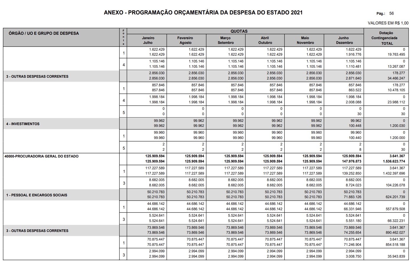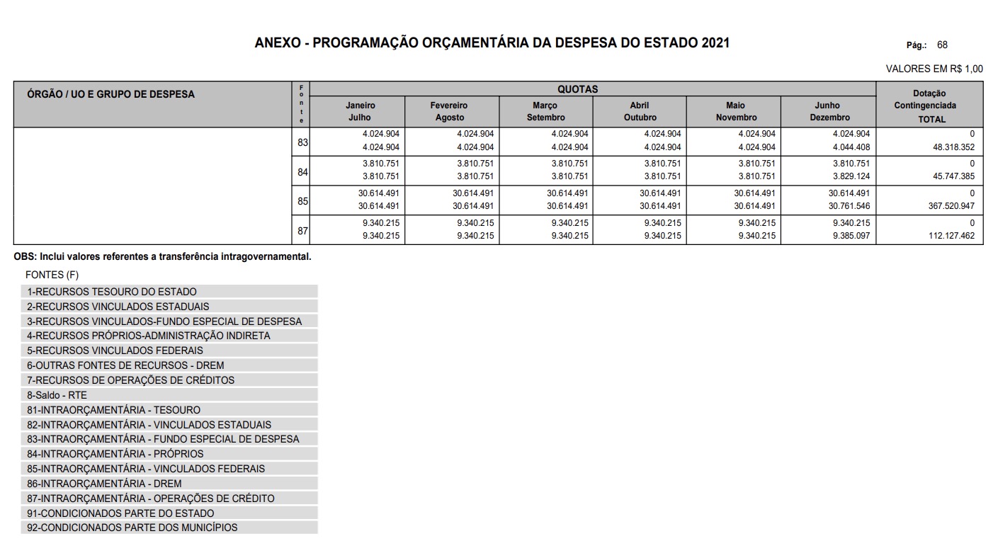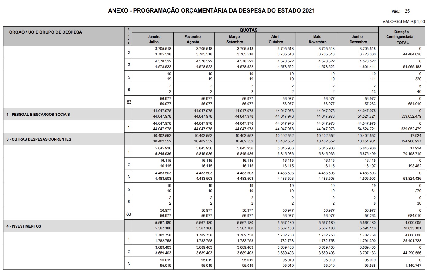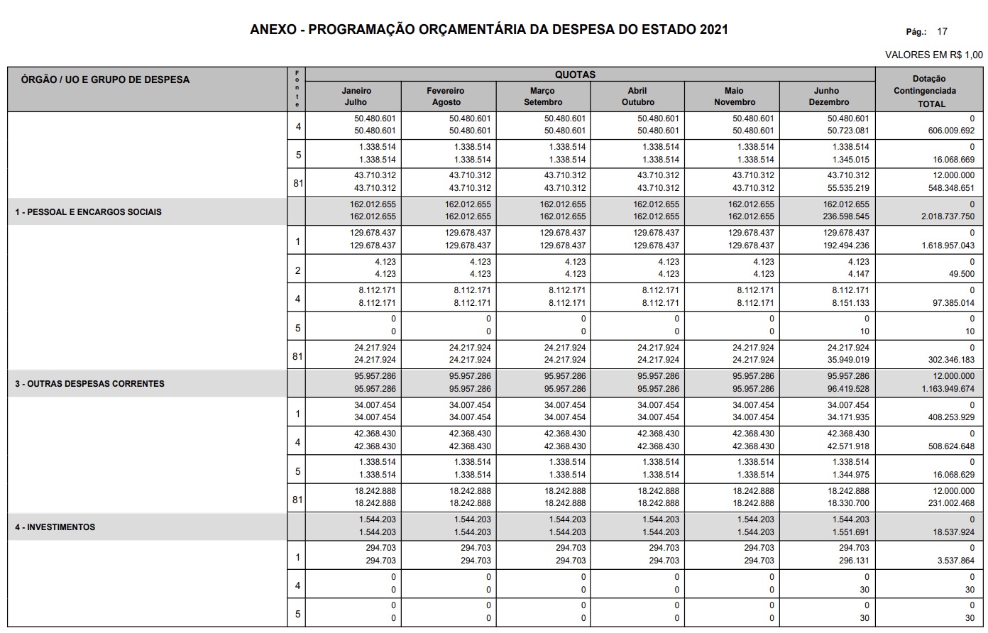 Considerando o imperativo legal de assegurar na execução orçamentária o princípio do equilíbrio entre despesas e receitas, estabelecido pela Lei nº 17.309 de 29 de dezembro de 2020, com a adoção de procedimentos que ajustem a realização do gasto ao comportamento efetivo da arrecadação, a fim de resguardar a estabilidade financeira do Tesouro do Estado;