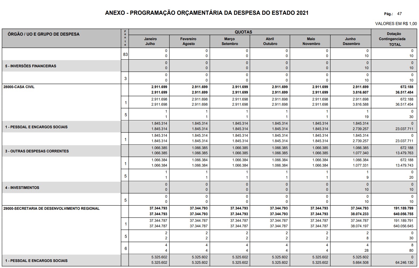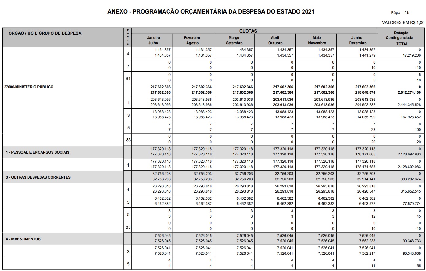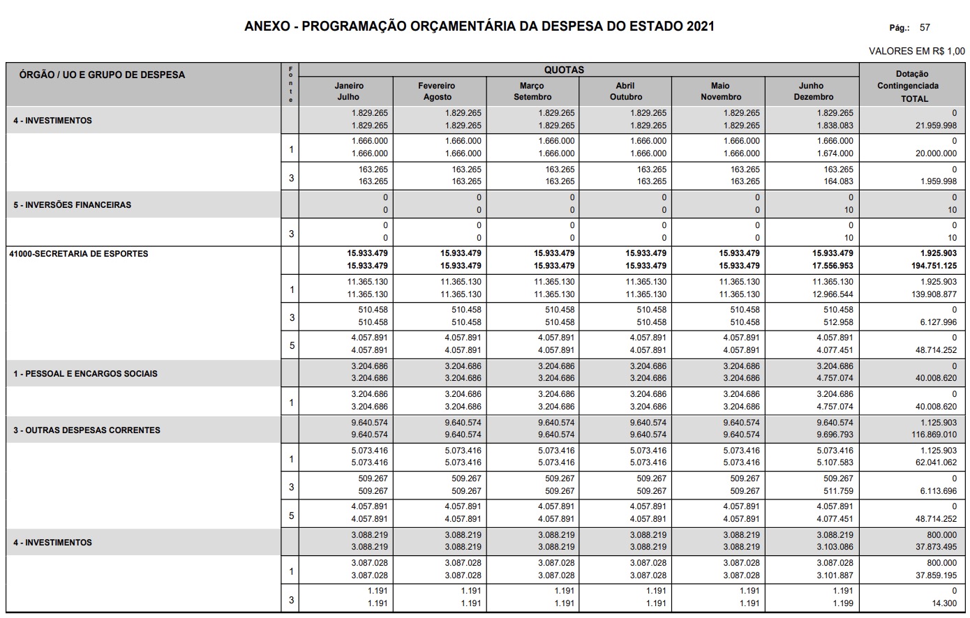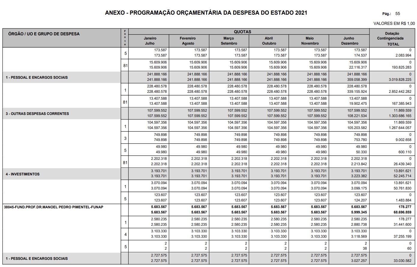 Considerando o imperativo legal de assegurar na execução orçamentária o princípio do equilíbrio entre despesas e receitas, estabelecido pela Lei nº 17.309 de 29 de dezembro de 2020, com a adoção de procedimentos que ajustem a realização do gasto ao comportamento efetivo da arrecadação, a fim de resguardar a estabilidade financeira do Tesouro do Estado;