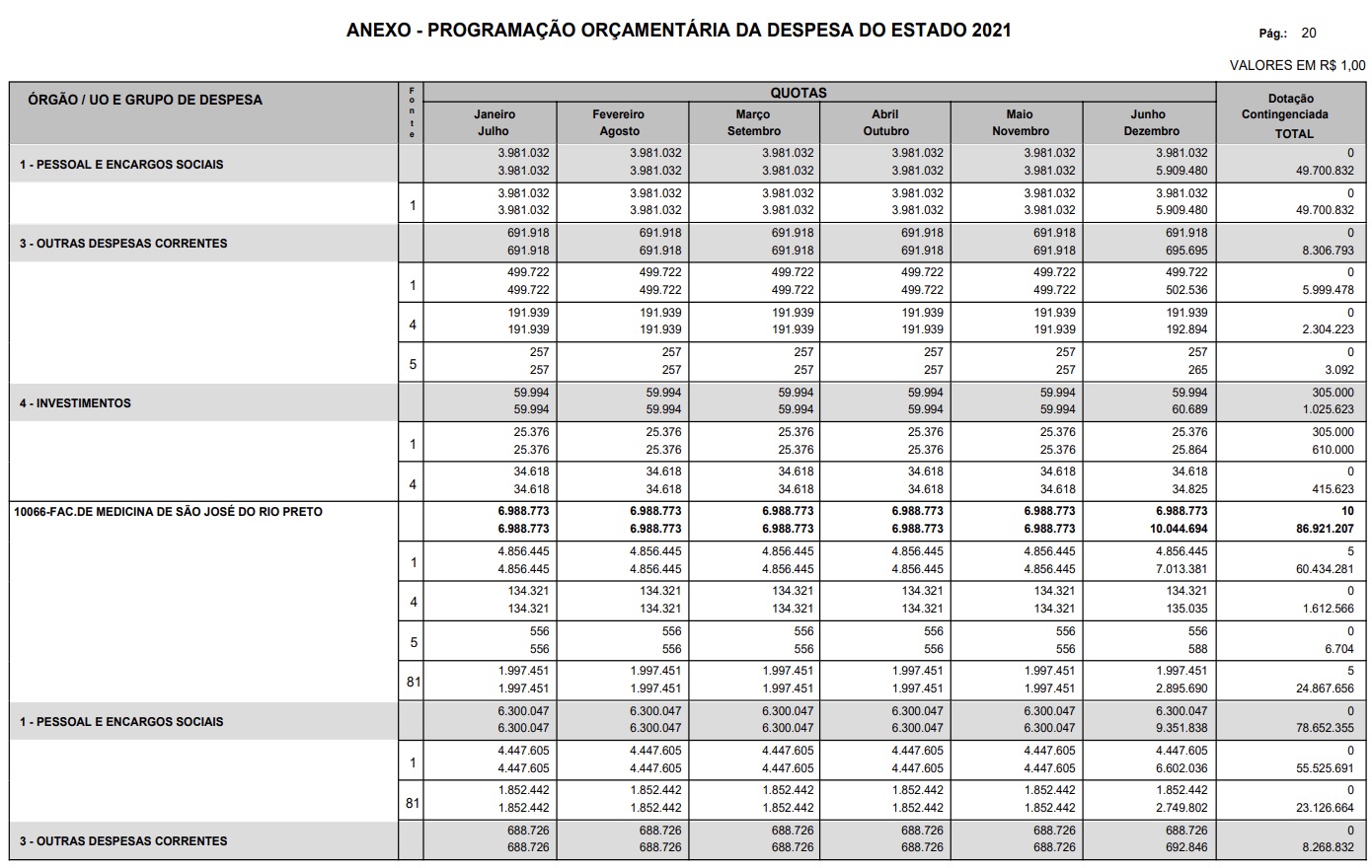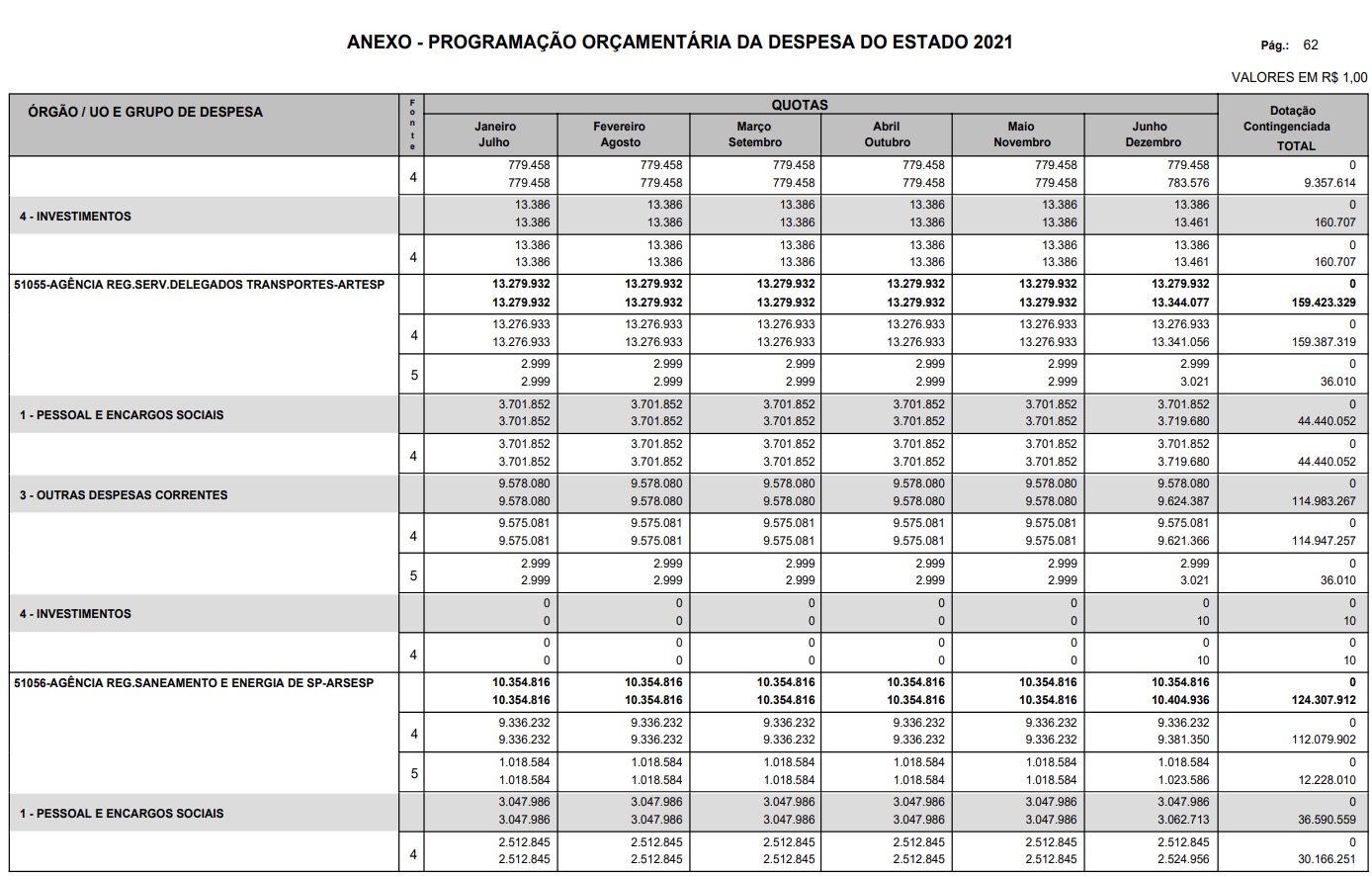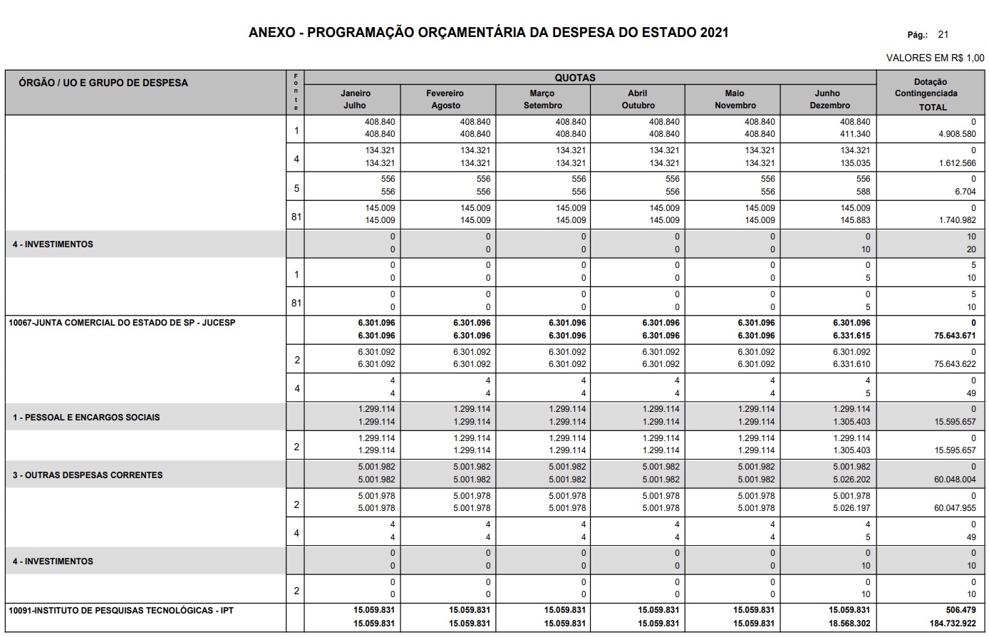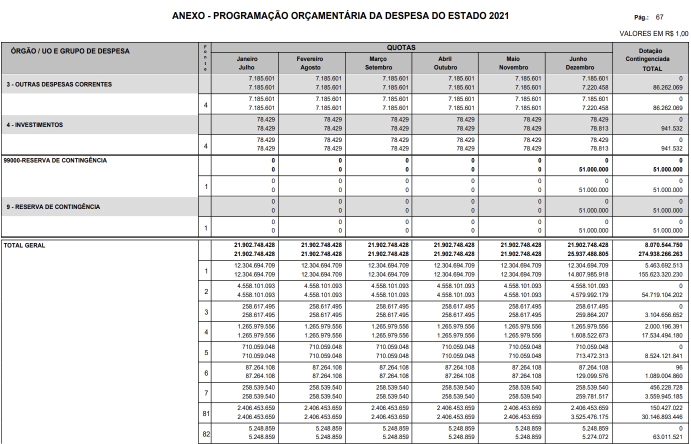 Artigo 8º - A Programação Orçamentária da Despesa do Estado é apresentada no Anexo deste decreto e reflete as dotações estabelecidas no orçamento aprovado pela Lei nº 17.309, de 29 de dezembro de 2020, ajustadas pelo Decreto nº 65.438, de 30 de dezembro de 2020, distribuídas em quotas, sendo uma contingenciada e as demais, mensais, correspondendo aos limites orçamentários, compatibilizados com as projeções das disponibilidades para o exercício.