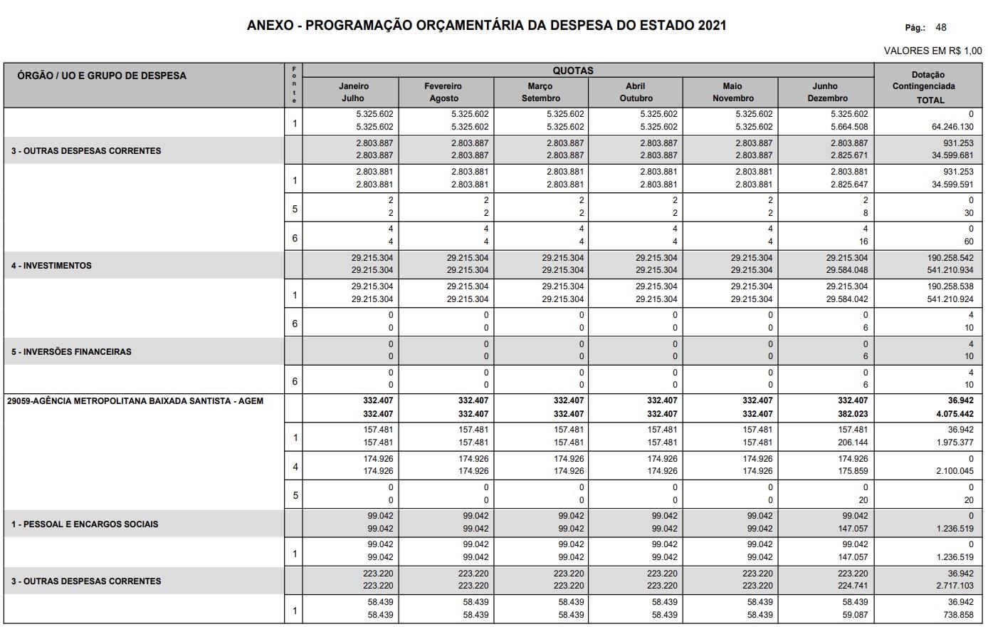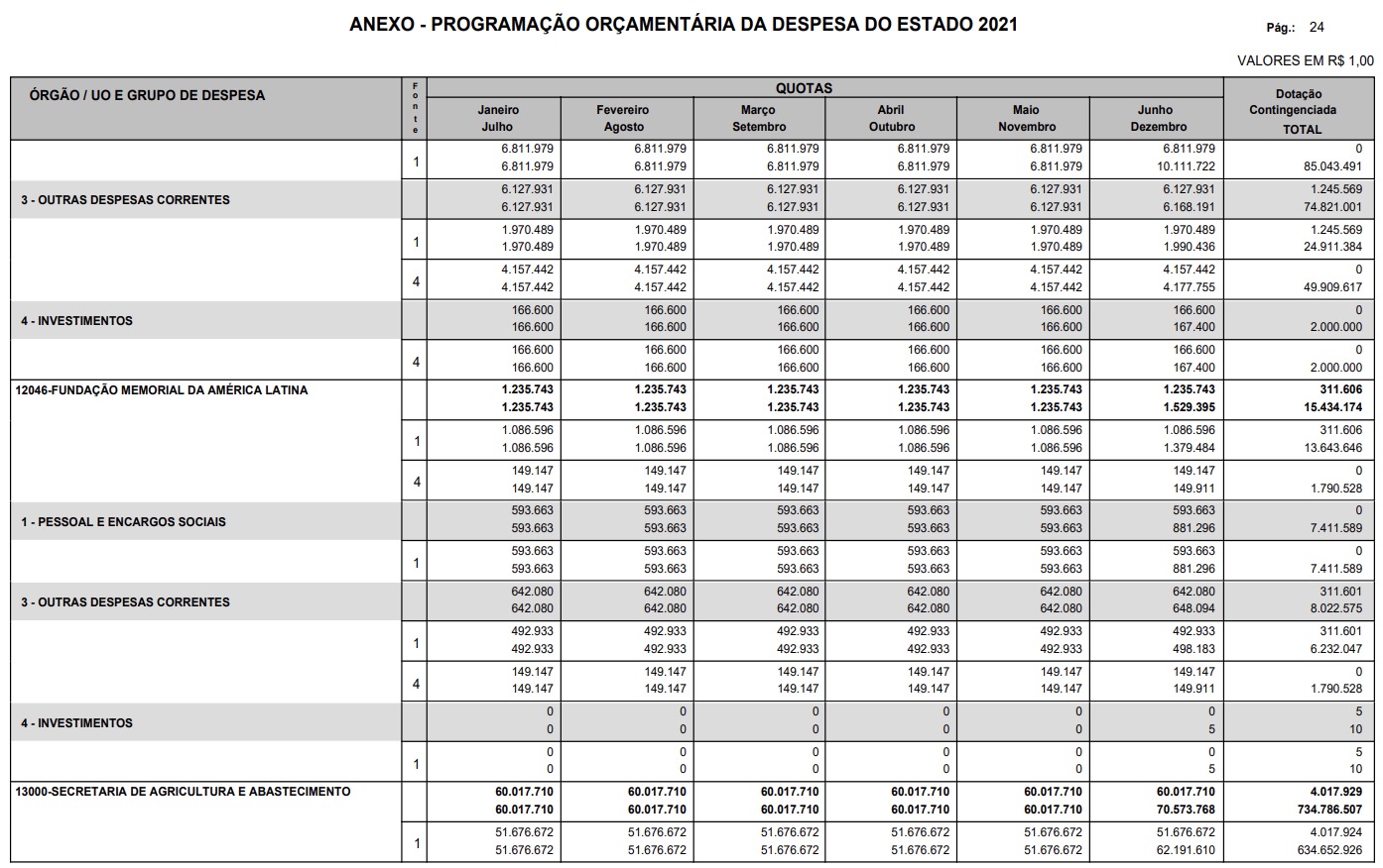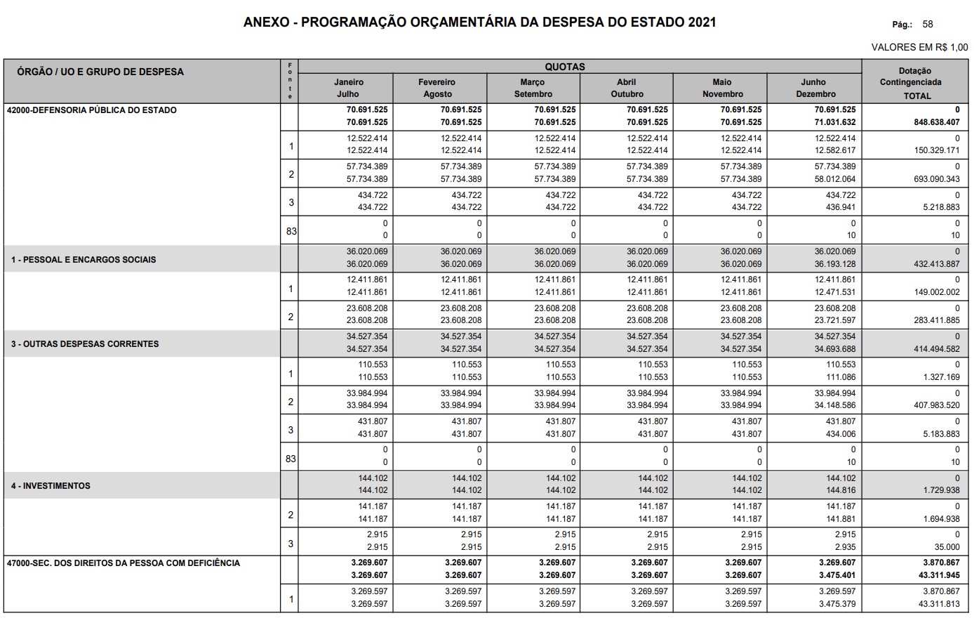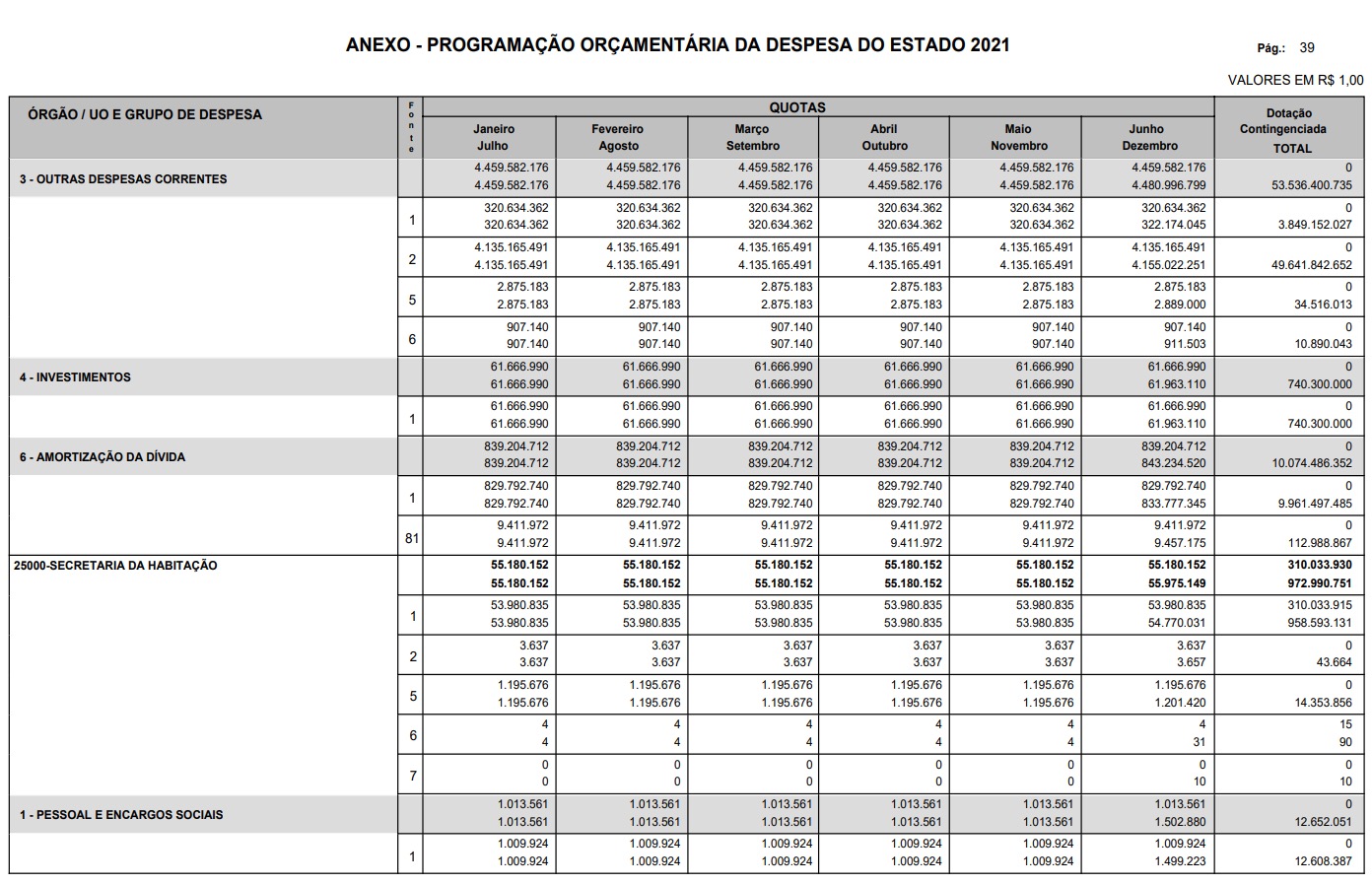Artigo 8º - A Programação Orçamentária da Despesa do Estado é apresentada no Anexo deste decreto e reflete as dotações estabelecidas no orçamento aprovado pela Lei nº 17.309, de 29 de dezembro de 2020, ajustadas pelo Decreto nº 65.438, de 30 de dezembro de 2020, distribuídas em quotas, sendo uma contingenciada e as demais, mensais, correspondendo aos limites orçamentários, compatibilizados com as projeções das disponibilidades para o exercício.