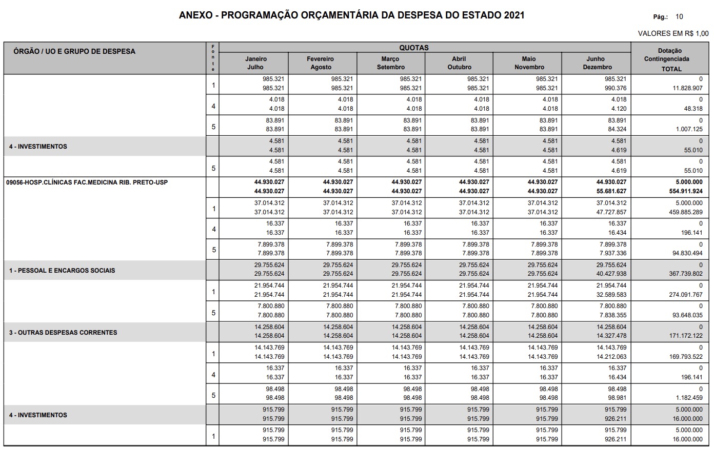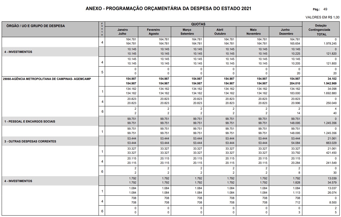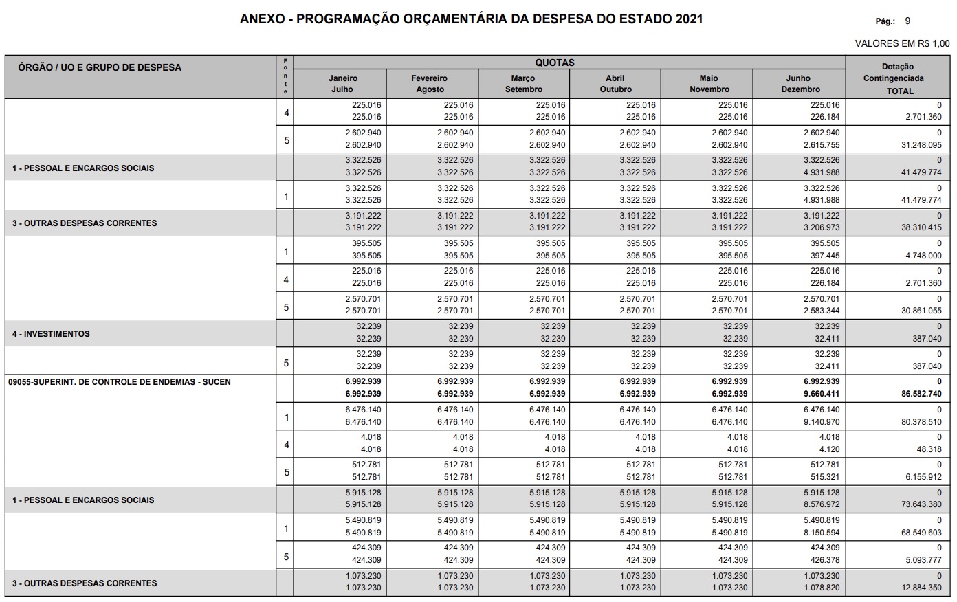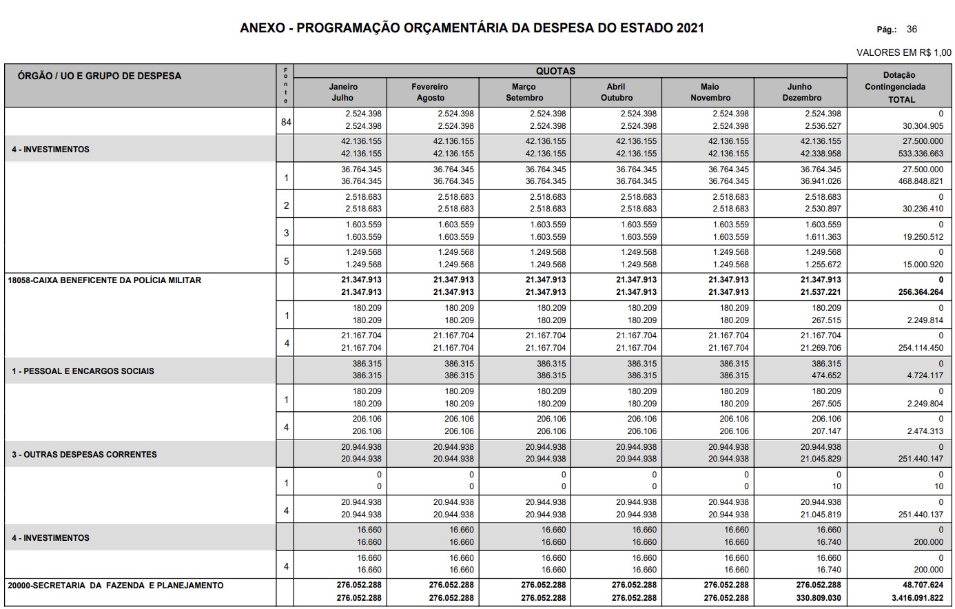 Artigo 8º - A Programação Orçamentária da Despesa do Estado é apresentada no Anexo deste decreto e reflete as dotações estabelecidas no orçamento aprovado pela Lei nº 17.309, de 29 de dezembro de 2020, ajustadas pelo Decreto nº 65.438, de 30 de dezembro de 2020, distribuídas em quotas, sendo uma contingenciada e as demais, mensais, correspondendo aos limites orçamentários, compatibilizados com as projeções das disponibilidades para o exercício.