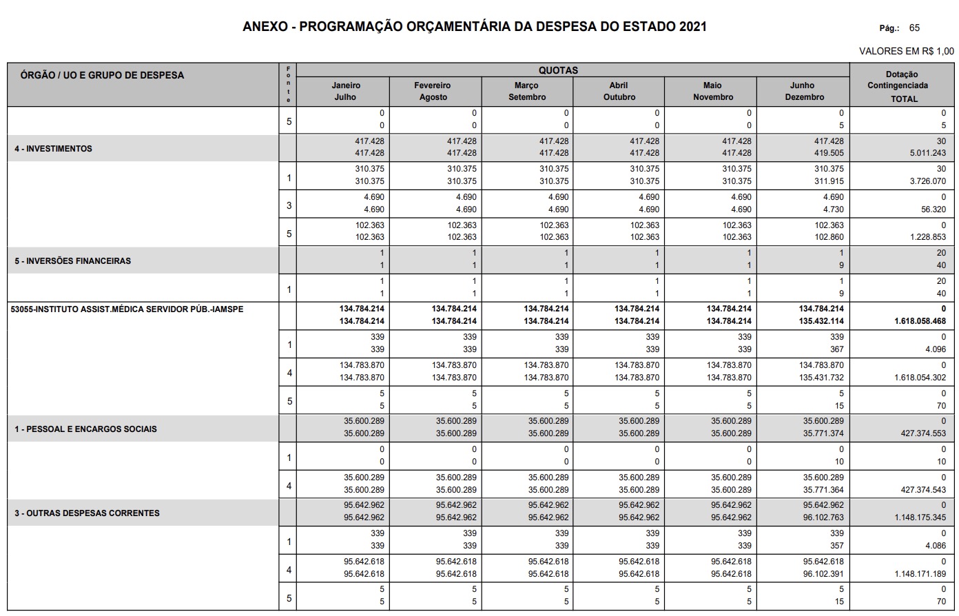 Artigo 6º - A distribuição das dotações orçamentárias aprovadas pela Lei nº 17.309, de 29 de dezembro de 2020, e ajustadas pelo Decreto nº 65.438, de 30 de dezembro de 2020, será automaticamente disponibilizada no SIAFEM/SP, observado o seguinte detalhamento: