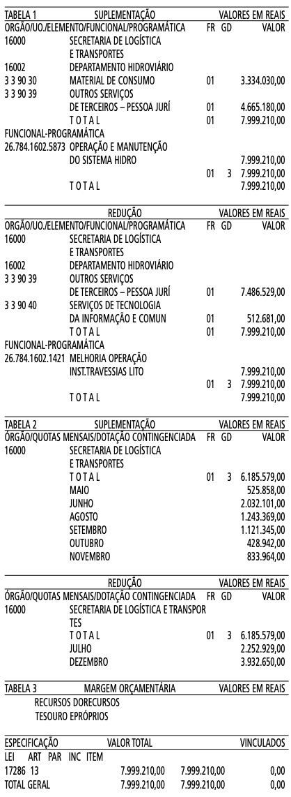 Artigo 1º - Fica aberto um crédito de R$ 7.999.210,00 (Sete milhões, novecentos e noventa e nove mil, duzentos e dez reais), suplementar ao orçamento da Secretaria de Logística e Transportes, observando-se as classificações Institucional, Econômica, Funcional e Programática, conforme a Tabela 1, anexa.