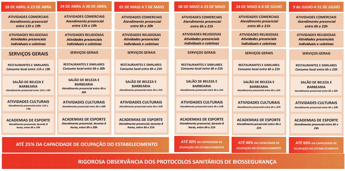O avanço da vacinação no Estado e, ainda, a observância das medidas não farmacológicas nos últimos meses contribuíram para uma significativa redução na curva de contágio. À vista dos indicadores de evolução da pandemia e de capacidade de resposta do sistema de saúde, é possível sugerir que a restrição em espaços de acesso ao público nesse momento seja de até 60% da respectiva capacidade, admitindo-se a extensão dos períodos de atendimento presencial até às 23h.
