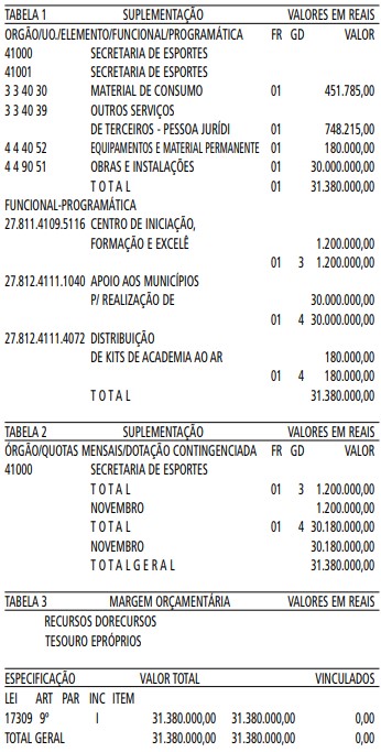 Artigo 1º - Fica aberto um crédito de R$ 31.380.000,00 (Trinta e um milhões, trezentos e oitenta mil reais), suplementar ao orçamento da Secretaria de Esportes, observando-se as classificações Institucional, Econômica, Funcional e Programática, conforme a Tabela 1, anexa.