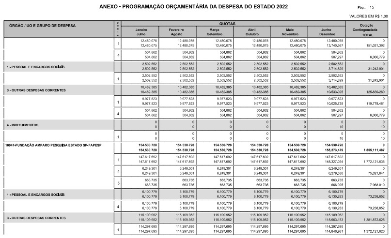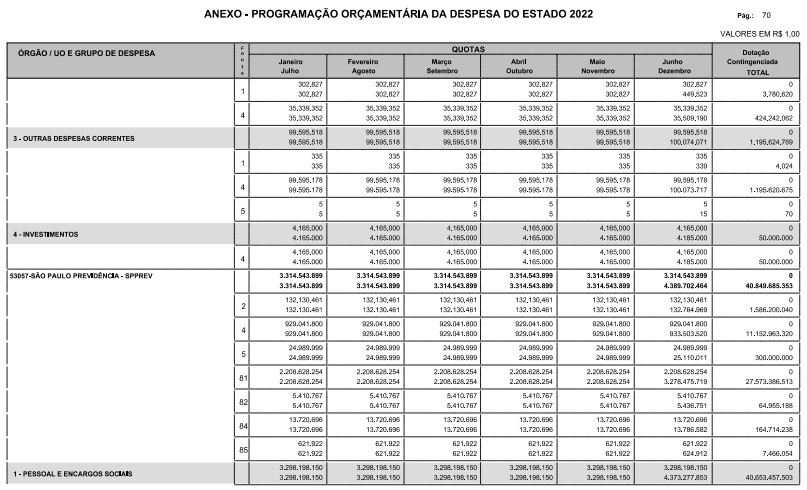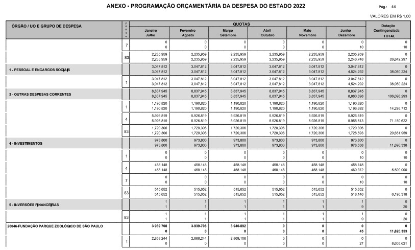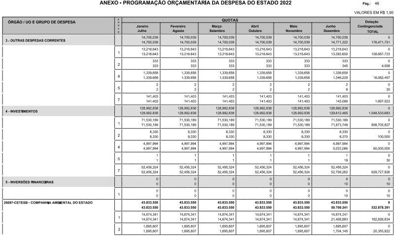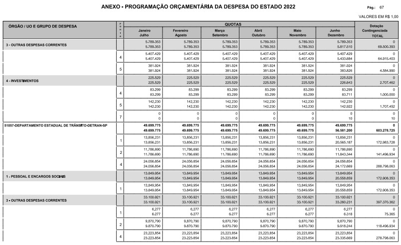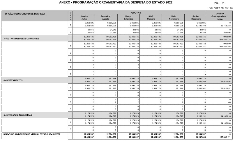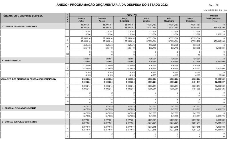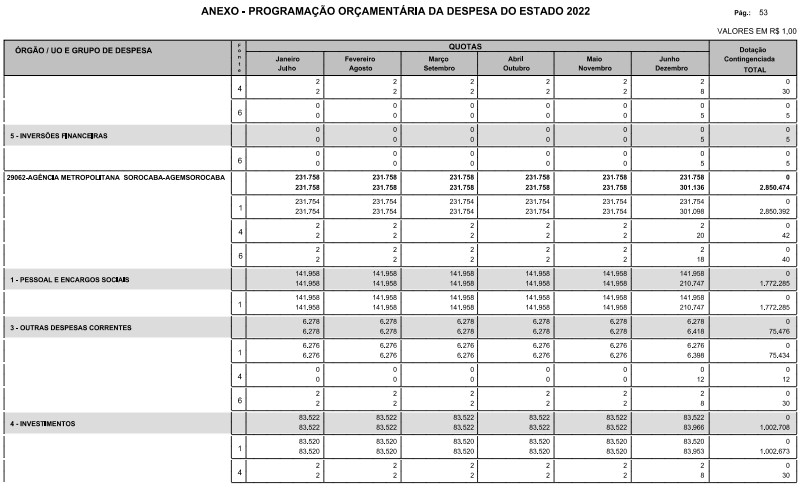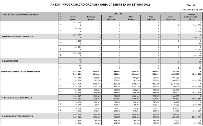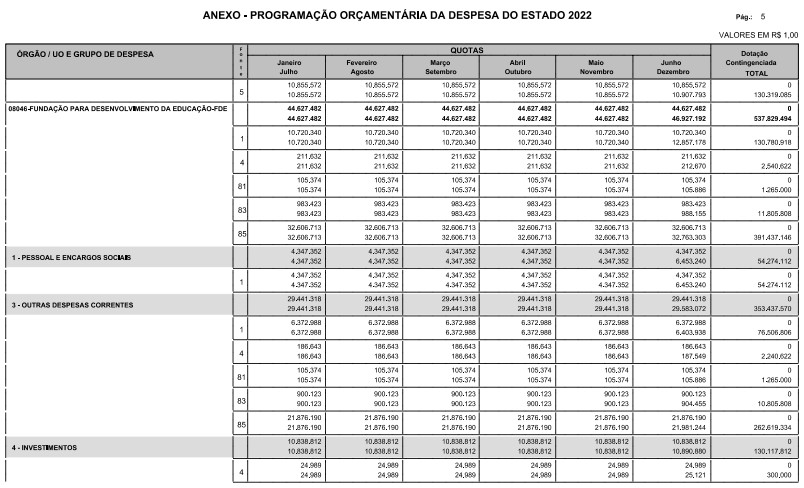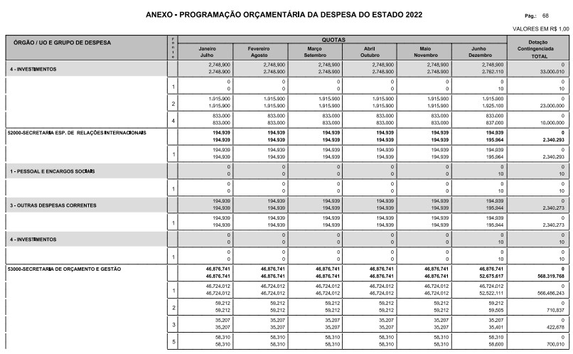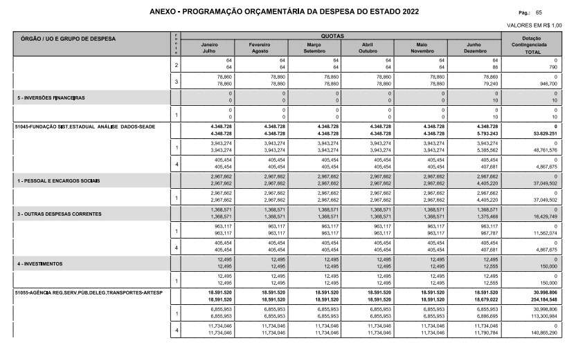 § 1º - A distribuição das dotações orçamentárias, por quotas, constantes do Anexo deste decreto, será automaticamente disponibilizada no SIA-FEM/SP com o seguinte detalhamento: