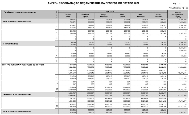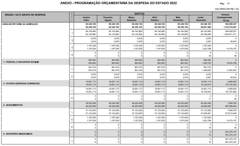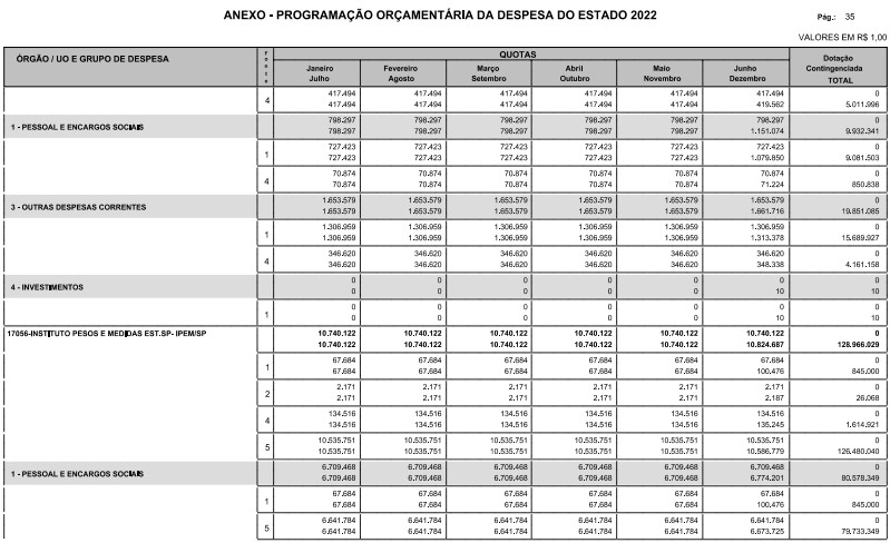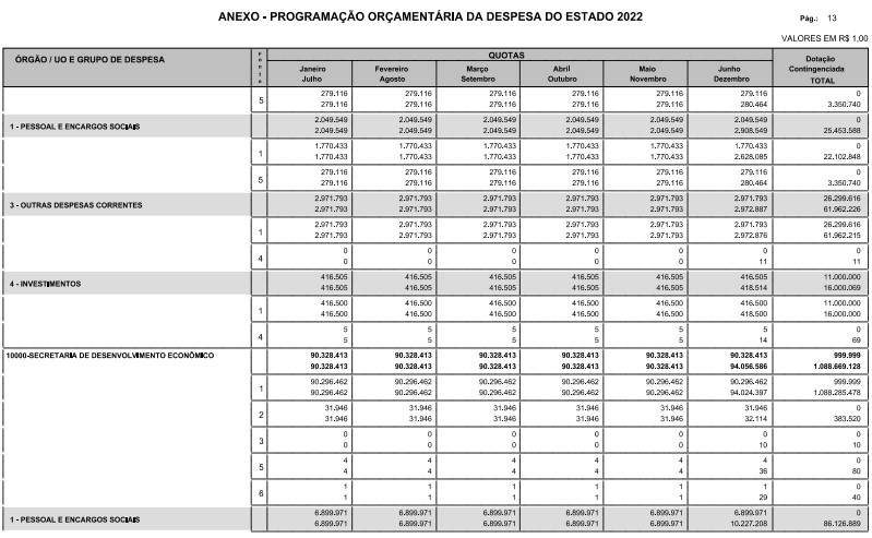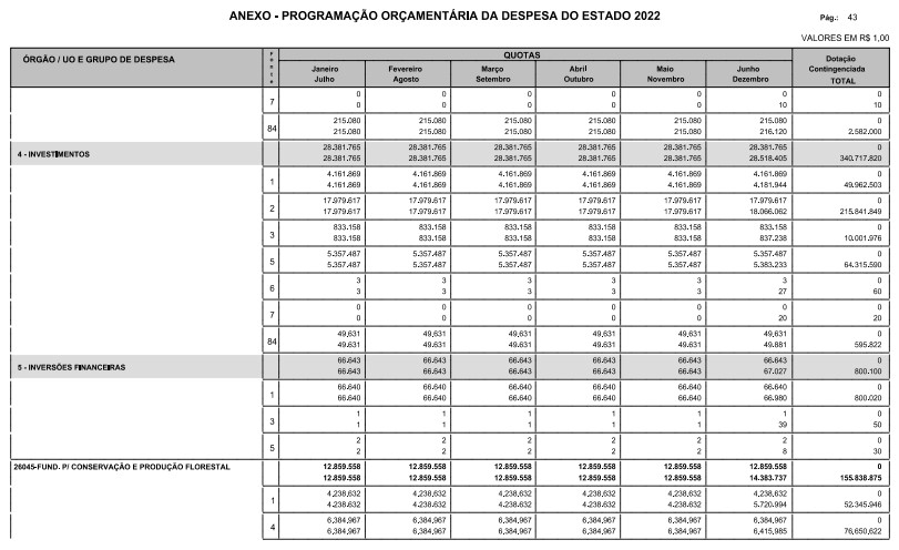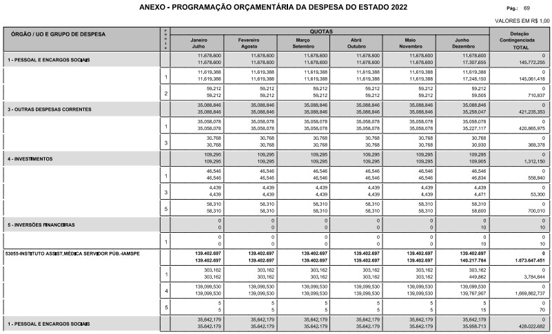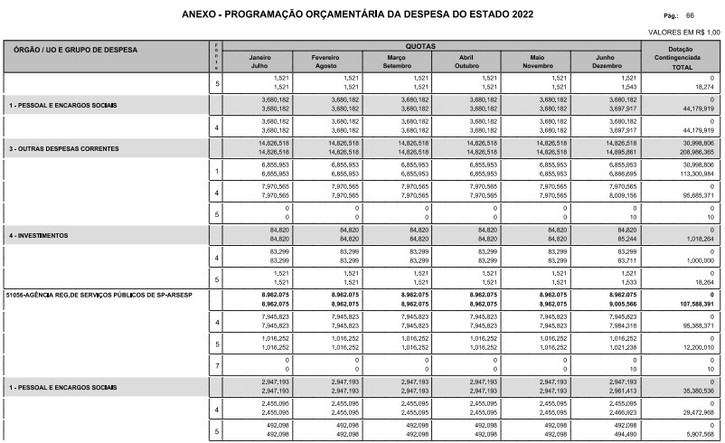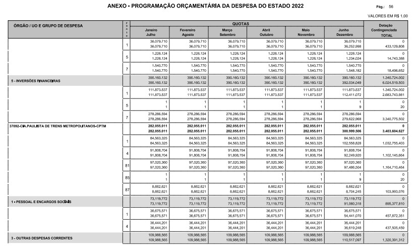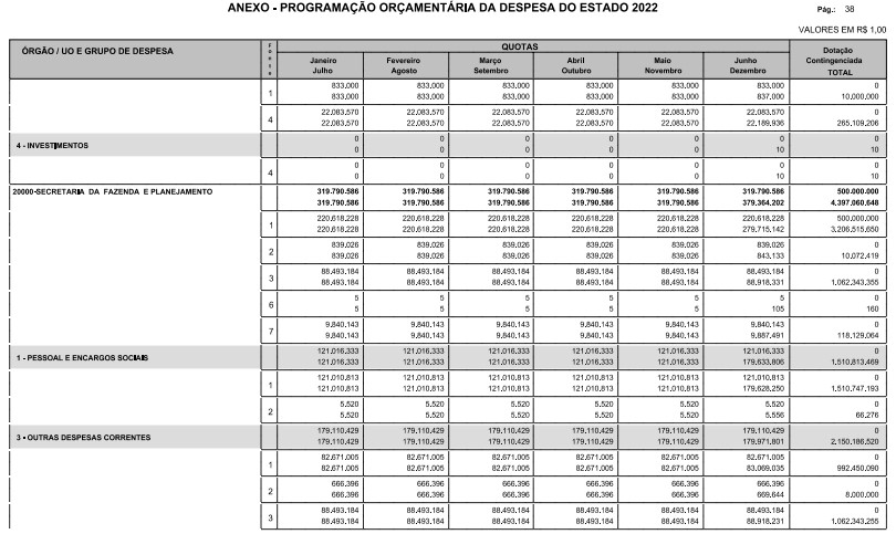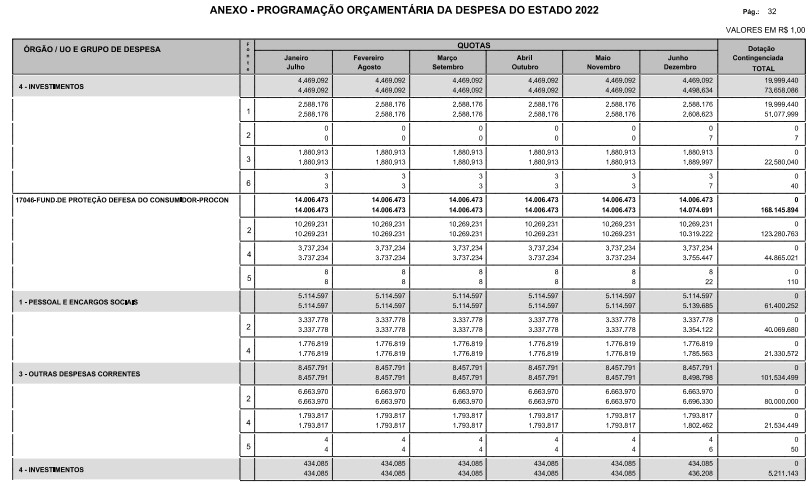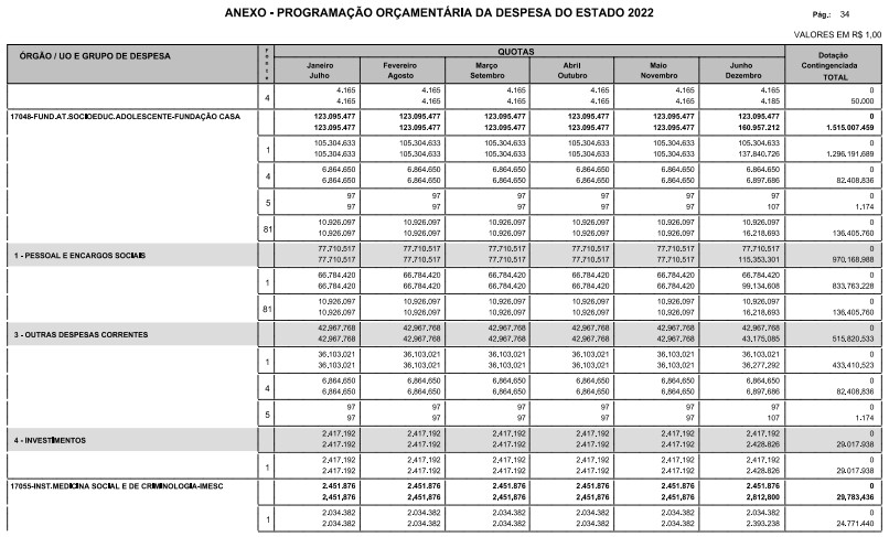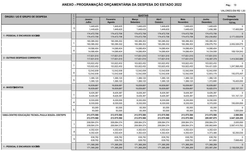 § 1º - A distribuição das dotações orçamentárias, por quotas, constantes do Anexo deste decreto, será automaticamente disponibilizada no SIA-FEM/SP com o seguinte detalhamento: