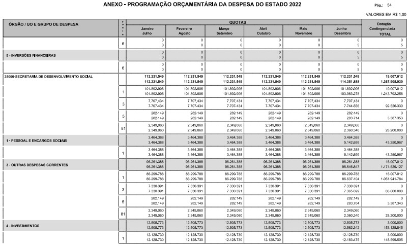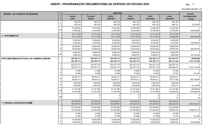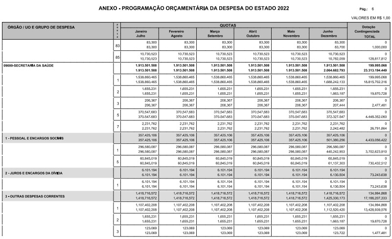 Artigo 6º - A distribuição das dotações orçamentárias aprovadas pela Lei nº 17.498, de 29 de dezembro de 2021, será automaticamente disponibilizada no SIAFEM/SP, observado o seguinte detalhamento: