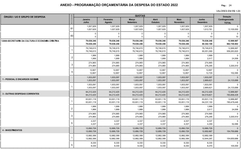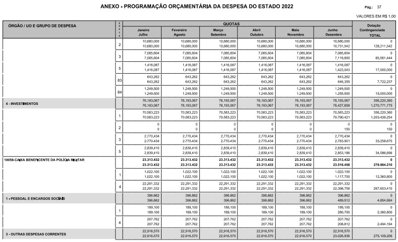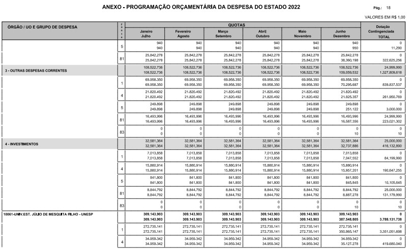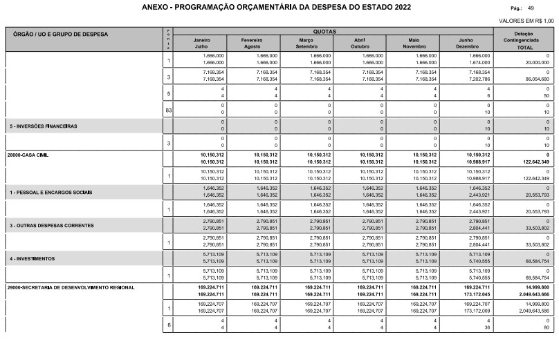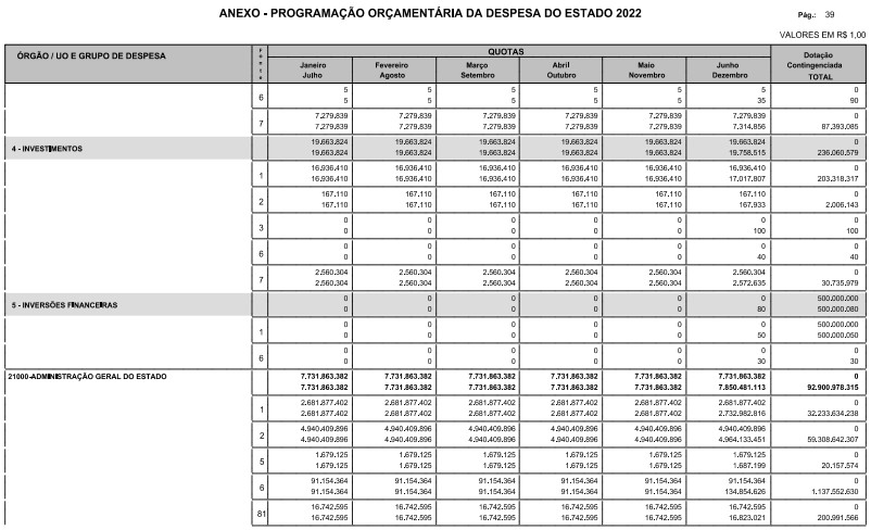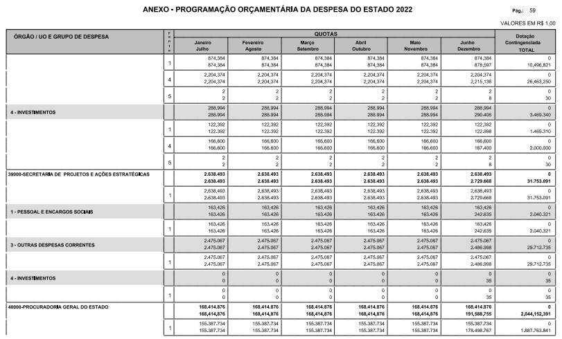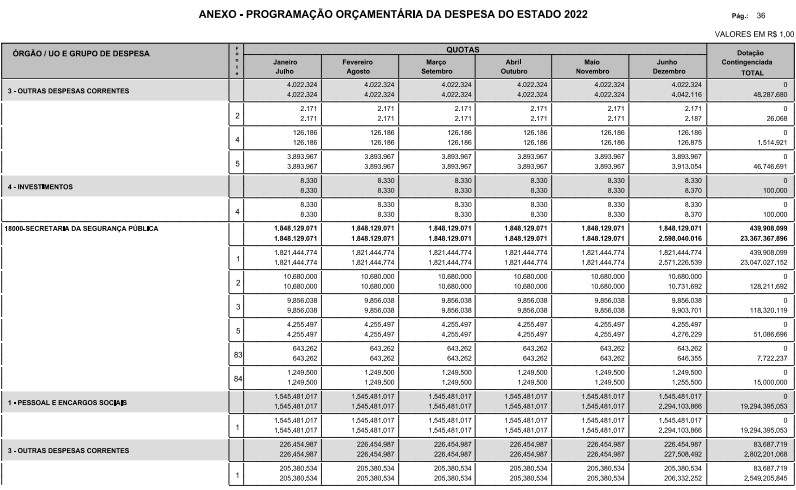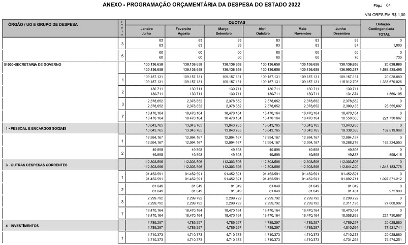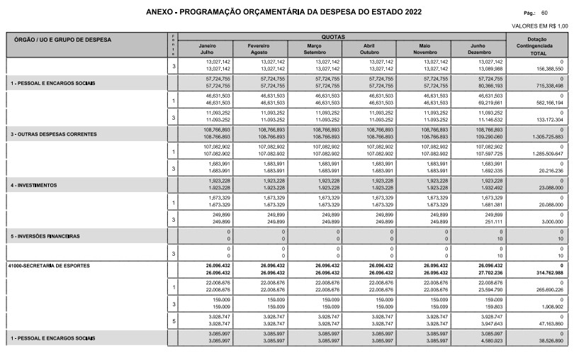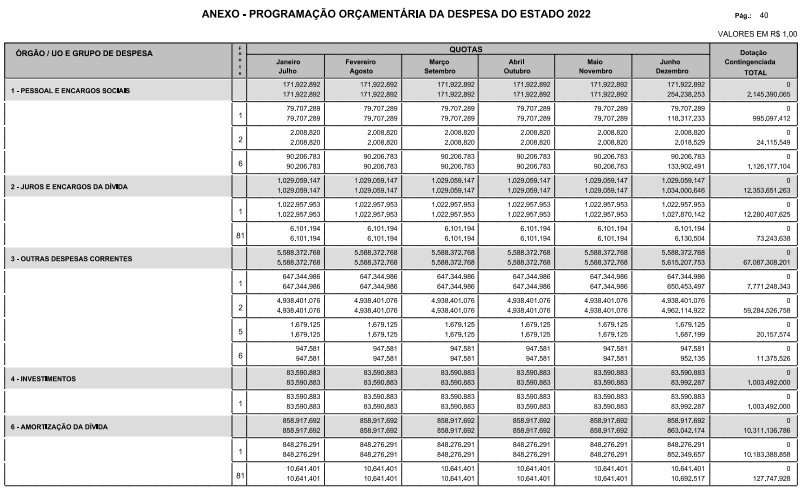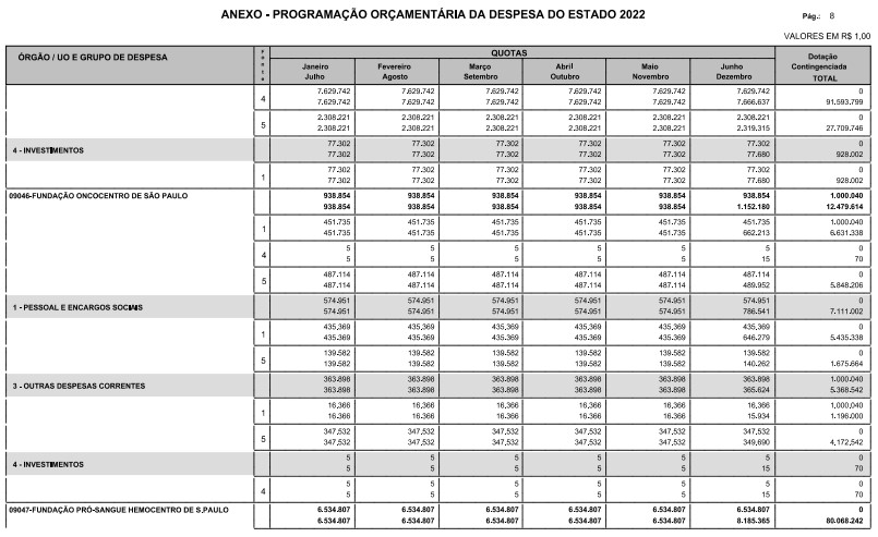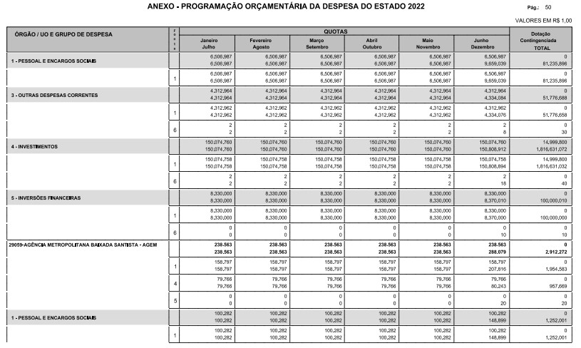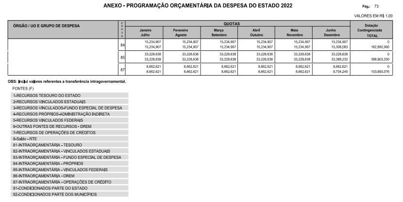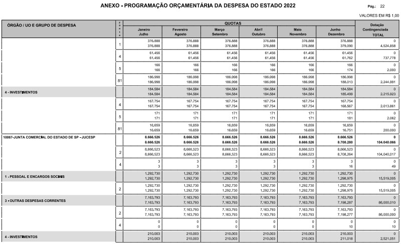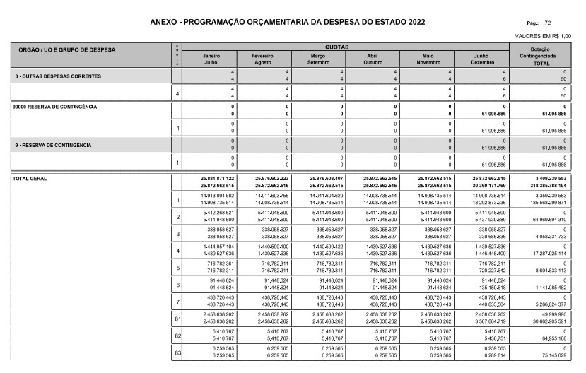 Artigo 8º - A Programação Orçamentária da Despesa do Estado é apresentada no Anexo deste decreto e reflete as dotações estabelecidas no orçamento aprovado pela Lei nº 17.498, de 29 de dezembro de 2021, distribuídas em quotas, sendo uma contingenciada e as demais, mensais, correspondendo aos limites orçamentários, compatibilizados com as projeções das disponibilidades para o exercício.