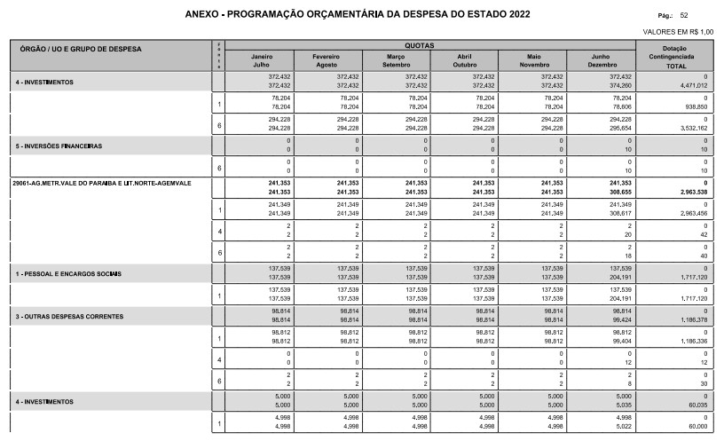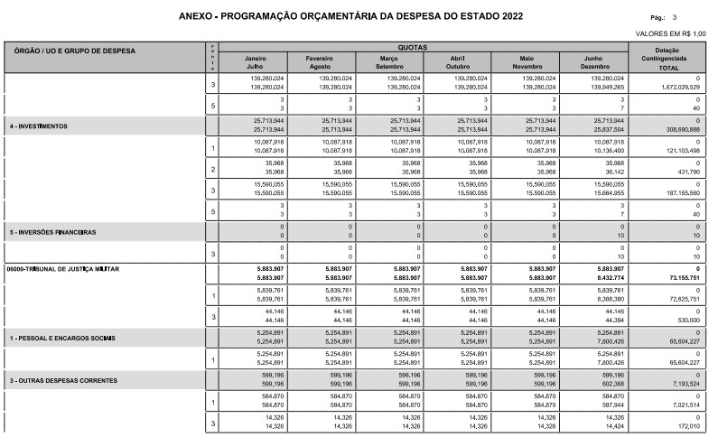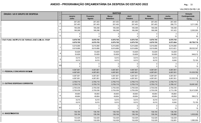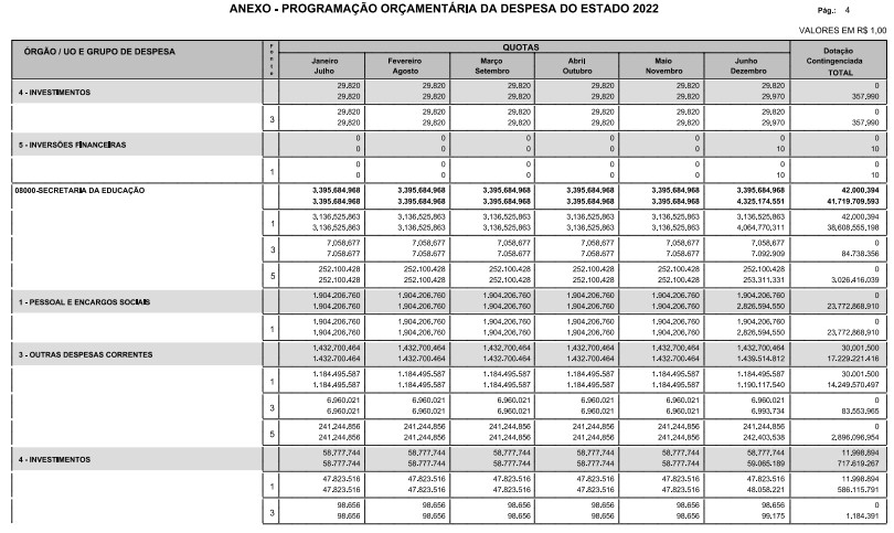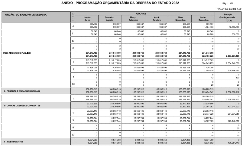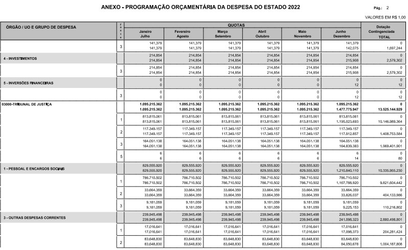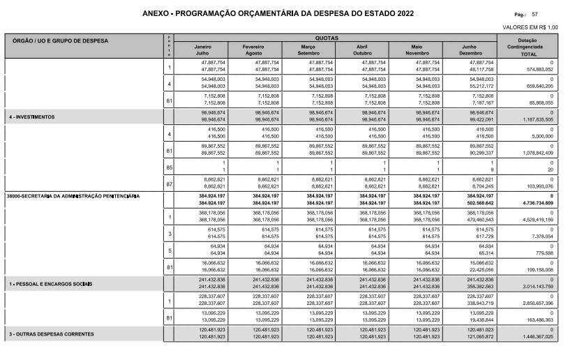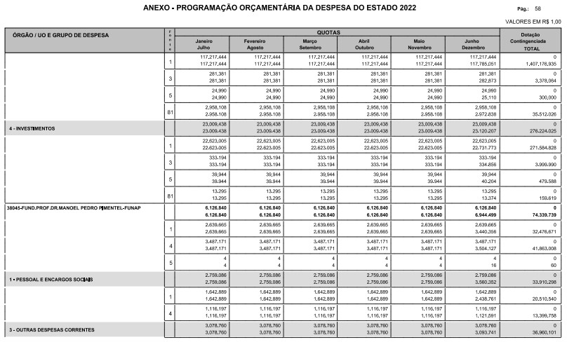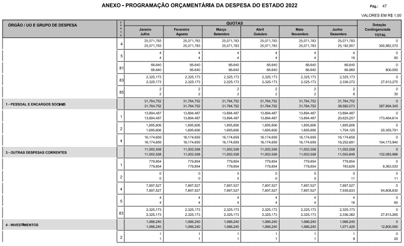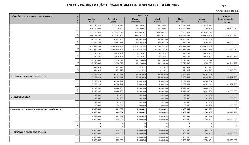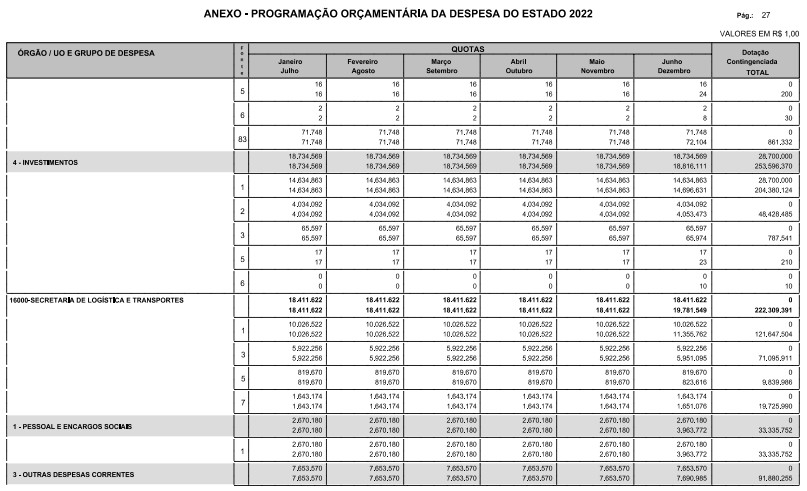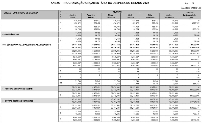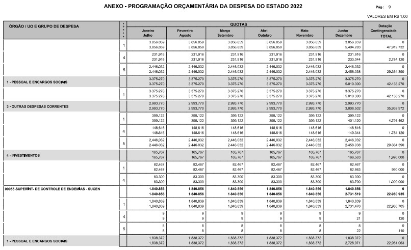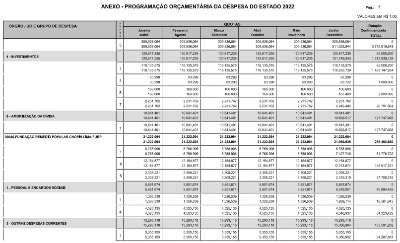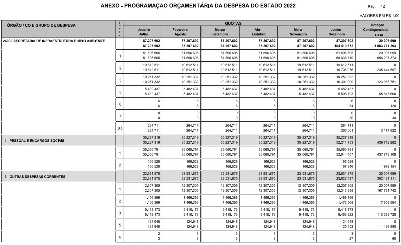 Artigo 8º - A Programação Orçamentária da Despesa do Estado é apresentada no Anexo deste decreto e reflete as dotações estabelecidas no orçamento aprovado pela Lei nº 17.498, de 29 de dezembro de 2021, distribuídas em quotas, sendo uma contingenciada e as demais, mensais, correspondendo aos limites orçamentários, compatibilizados com as projeções das disponibilidades para o exercício.