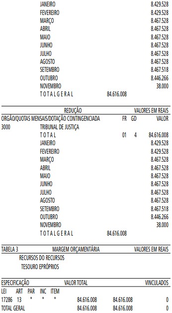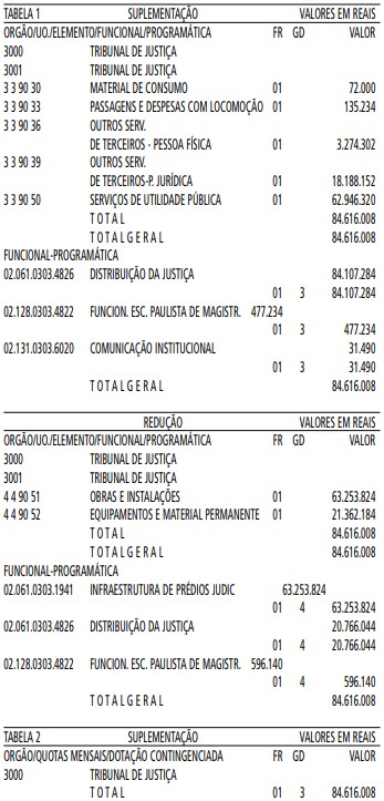 Artigo 1° - Fica aberto um crédito de R$84.616.008,00 (Oitenta e quatro milhões, seiscentos e dezesseis mil e oito reais), suplementar ao orçamento do Tribunal de Justiça, observando-se as classificações Institucional, Econômica, Funcional e Programática, conforme a Tabela 1, anexa.