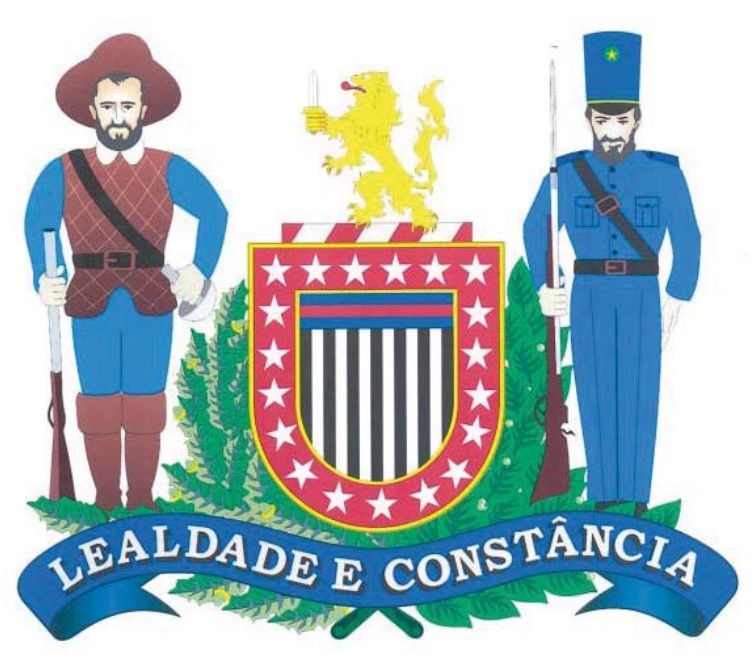 "O Brasão de Armas da Polícia Militar do Estado de São Paulo será um Escudo Português, perfilado em ouro, tendo uma bordadura vermelha carregada de 19 (dezenove) estrelas de 5 (cinco) pontas em prata, representando marcos históricos da Instituição; no centro, em listras verticais e horizontais, as cores representativas da Bandeira Paulista, também perfiladas em ouro; como timbre, um leão rampante em ouro, apoiado sobre um virol em vermelho e prata, empunhando um gládio, com punho em ouro e lâmina em prata; à direita do Brasão um ramo de carvalho e à esquerda um ramo de louro, cruzados em sua base; como tenentes, à direita a figura de um Bandeirante, em posição de sentido, com bacamarte e espada, e à esquerda um Soldado da Guarda Municipal Permanente empunhando um fuzil com baioneta; num listel em azul, a legenda em prata "Lealdade e Constância".".(NR)