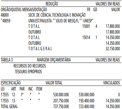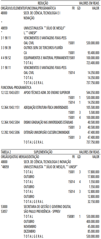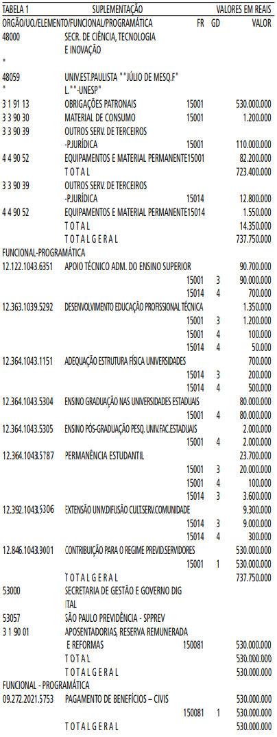 Artigo 1° - Fica aberto um crédito de R$ 737.750.000,00 (setecentos e trinta e sete milhões, setecentos e cinquenta mil reais), suplementar ao orçamento da Universidade Estadual Paulista Júlio de Mesquita Filho-UNESP, observando-se as classificações Institucional, Econômica, Funcional e Programática, conforme a Tabela 1, anexa.