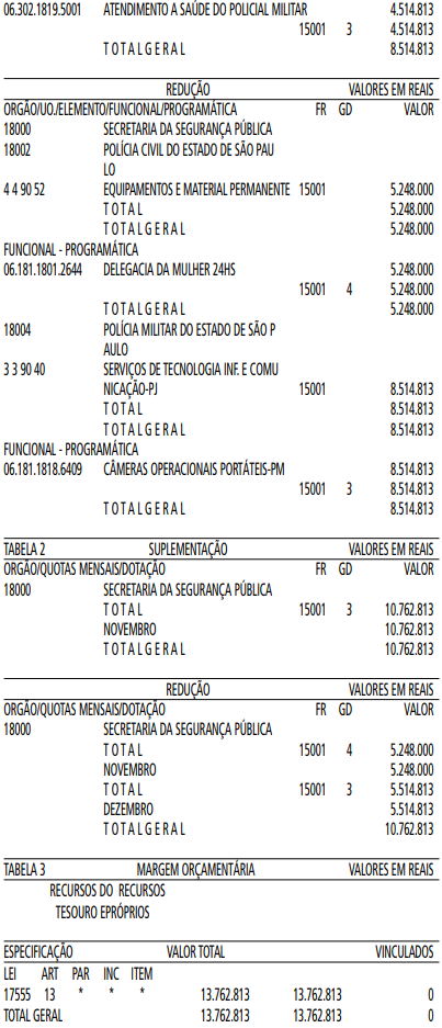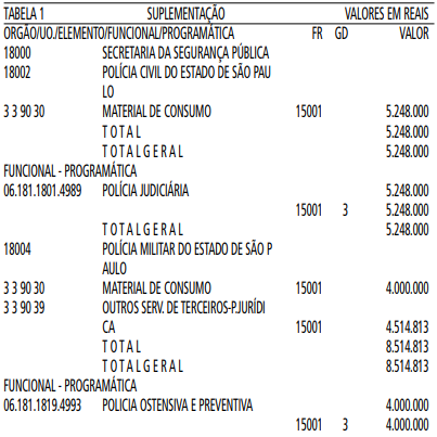 Artigo 1° - Fica aberto um crédito de R$ 13.762.813,00 (treze milhões, setecentos e sessenta e dois mil, oitocentos e treze reais), suplementar ao orçamento da Secretaria da Segurança Pública, observando-se as classificações Institucional, Econômica, Funcional e Programática, conforme a Tabela 1, anexa.