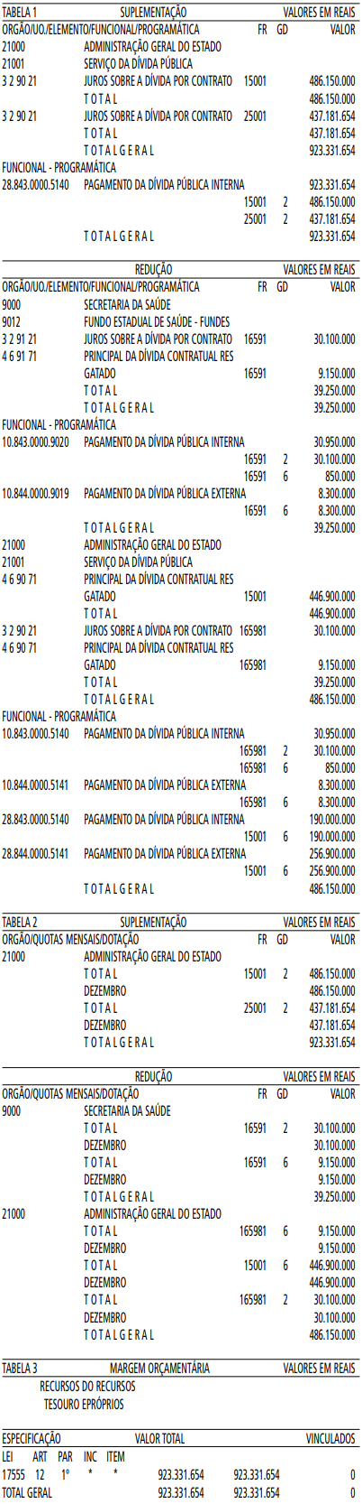 Artigo 1° - Fica aberto um crédito de R$ 923.331.654,00 (novecentos e vinte e três milhões, trezentos e trinta e um mil, seiscentos e cinquenta e quatro reais), suplementar ao orçamento da Administração Geral do Estado, observando-se as classificações Institucional, Econômica, Funcional e Programática, conforme a Tabela 1, anexa.