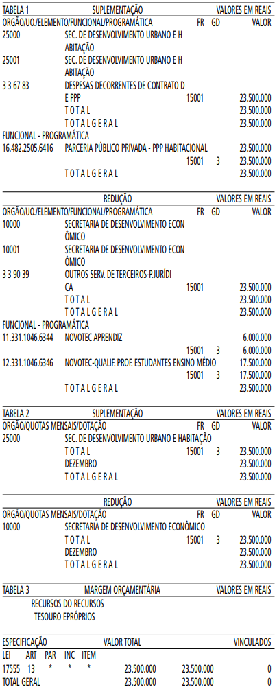 Artigo 1° - Fica aberto um crédito de R$ 23.500.000,00 (vinte e três milhões e quinhentos mil reais), suplementar ao orçamento do Fundo Paulista de Habitação de Interesse Social-FPHIS, observando-se as classificações Institucional, Econômica, Funcional e Programática, conforme a Tabela 1, anexa.