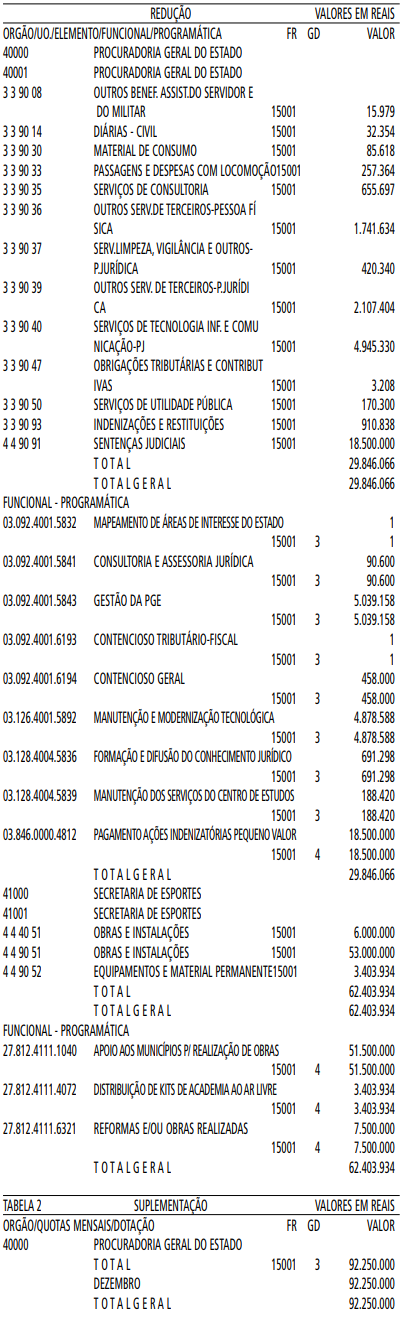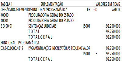 Artigo 1° - Fica aberto um crédito de R$ 92.250.000,00 (noventa e dois milhões, duzentos e cinquenta mil reais), suplementar ao orçamento da Procuradoria Geral do Estado, observando-se as classificações Institucional, Econômica, Funcional e Programática, conforme a Tabela 1, anexa.