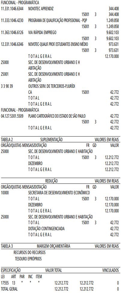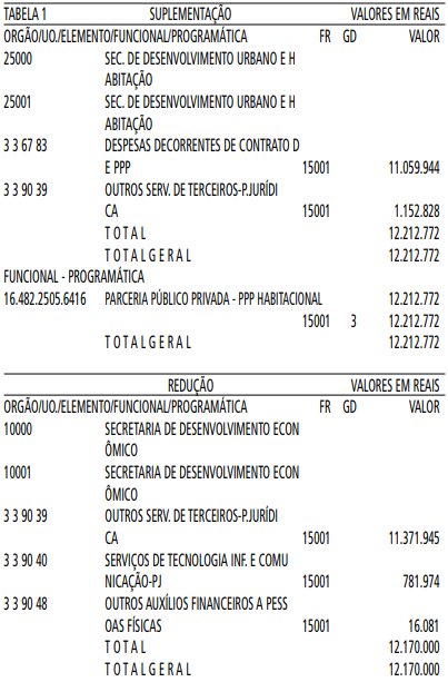 Artigo 1° - Fica aberto um crédito de R$ 12.212.772,00 (doze milhões, duzentos e doze mil, setecentos e setenta e dois reais), suplementar ao orçamento da Secretaria de Desenvolvimento Urbano e Habitação, observando-se as classificações Institucional, Econômica, Funcional e Programática, conforme a Tabela 1, anexa.