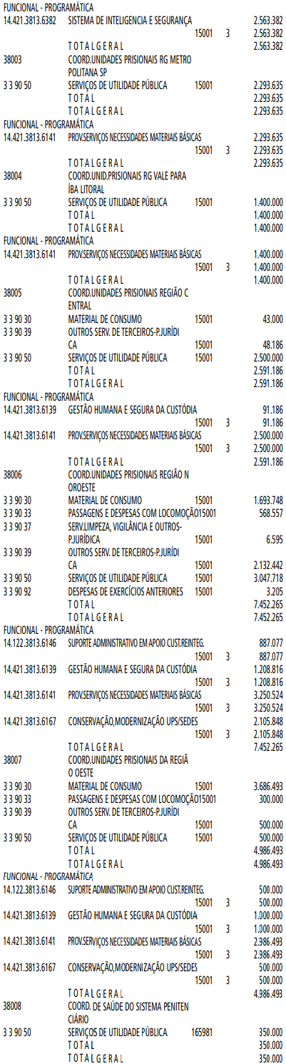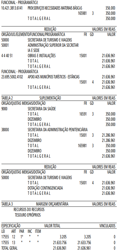 Artigo 1° - Fica aberto um crédito de R$ 21.636.961,00 (vinte e um milhões, seiscentos e trinta e seis mil, novecentos e sessenta e um reais), suplementar ao orçamento da Secretaria da Administração Penitenciária, observando-se as classificações Institucional, Econômica, Funcional e Programática, conforme a Tabela 1, anexa.