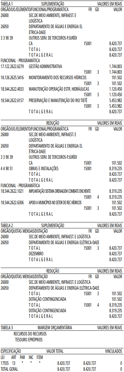 Artigo 1° - Fica aberto um crédito de R$ 8.420.737,00 (oito milhões, quatrocentos e vinte mil, setecentos e trinta e sete reais), suplementar ao orçamento do Departamento de Águas e Energia Elétrica-DAEE, observando-se as classificações Institucional, Econômica, Funcional e Programática, conforme a Tabela 1, anexa.