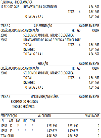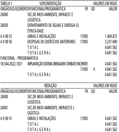 Artigo 1° - Fica aberto um crédito de R$ 4.641.562,00 (quatro milhões, seiscentos e quarenta e um mil, quinhentos e sessenta e dois reais), suplementar ao orçamento do Departamento de Águas e Energia Elétrica-DAEE, observando-se as classificações Institucional, Econômica, Funcional e Programática, conforme a Tabela 1, anexa.