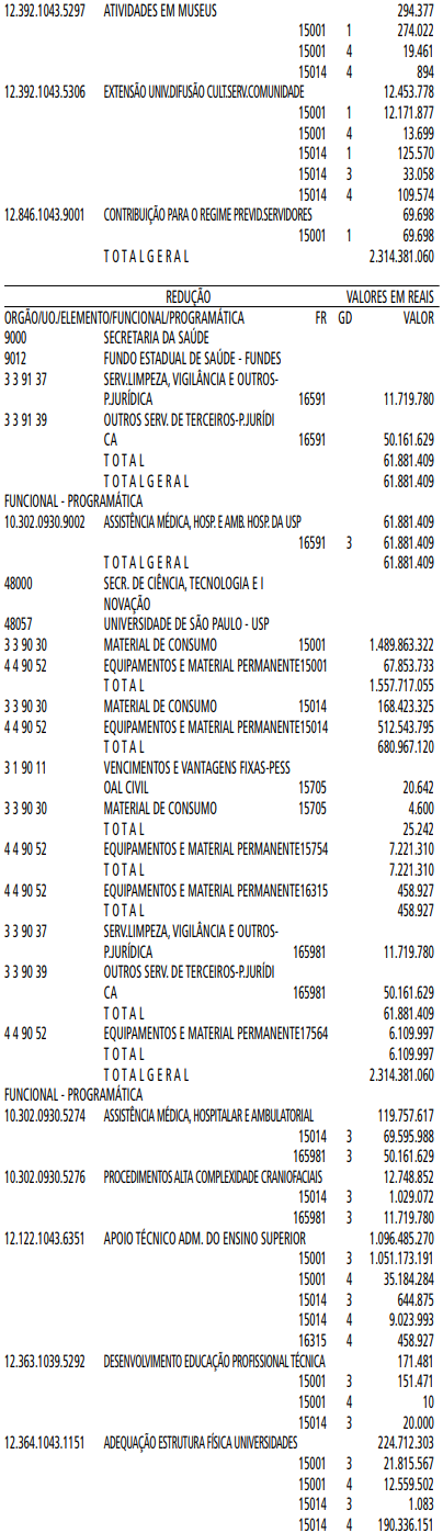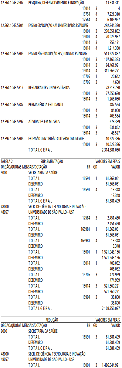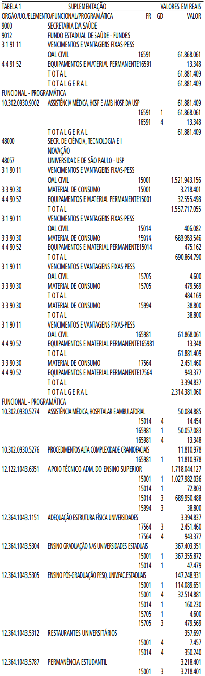 Artigo 1° - Fica aberto um crédito de R$ 2.314.381.060,00 (dois bilhões, trezentos e quatorze milhões, trezentos e oitenta e um mil e sessenta reais), suplementar ao orçamento da Universidade de São Paulo-USP, observando-se as classificações Institucional, Econômica, Funcional e Programática, conforme a Tabela 1, anexa.