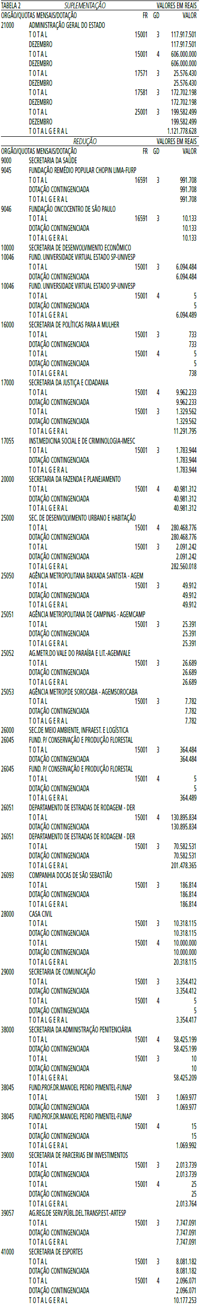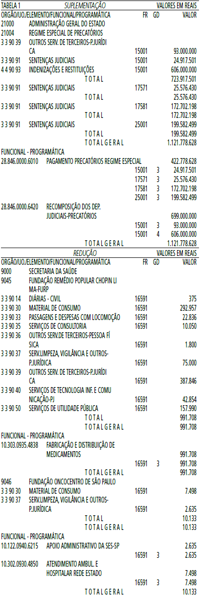 Artigo 1° - Fica aberto um crédito de R$ 1.121.778.628,00 (um bilhão, cento e vinte e um milhões, setecentos e setenta e oito mil, seiscentos e vinte e oito reais), suplementar ao orçamento da Administração Geral do Estado, observando-se as classificações Institucional, Econômica, Funcional e Programática, conforme a Tabela 1, anexa.