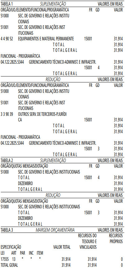 Artigo 1° - Fica aberto um crédito de R$ 31.914,00 (trinta e um mil e novecentos e quatorze reais), suplementar ao orçamento da Secretaria de Governo e Relações Institucionais, observando-se as classificações Institucional, Econômica, Funcional e Programática, conforme a Tabela 1, anexa.
