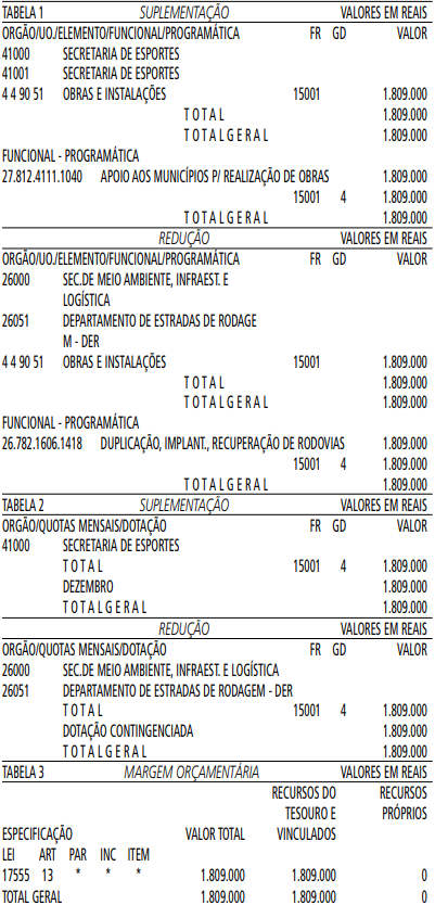 Artigo 1° - Fica aberto um crédito de R$ 1.809.000,00 (um milhão oitocentos e nove mil reais), suplementar ao orçamento da Secretaria de Esportes, observando-se as classificações Institucional, Econômica, Funcional e Programática, conforme a Tabela 1, anexa.
