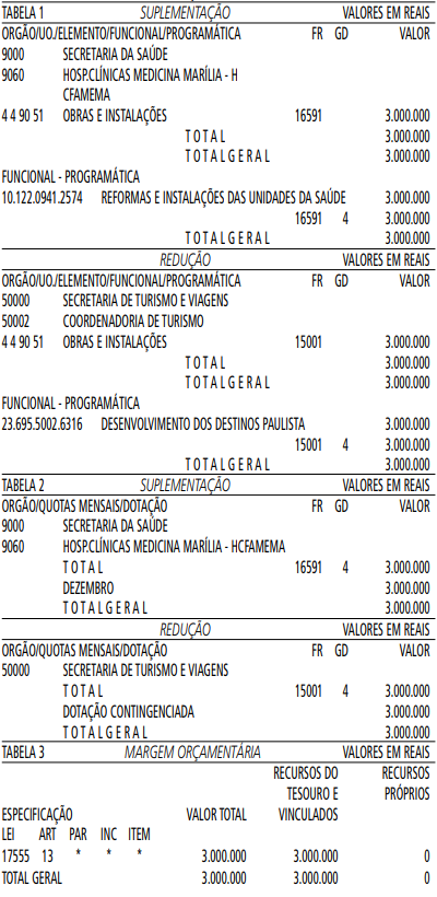 Artigo 1° - Fica aberto um crédito de R$ 3.000.000,00 (três milhões de reais), suplementar ao orçamento do Hospital das Clínicas da Faculdade de Medicina de Marília-HCFAMEMA, observando-se as classificações Institucional, Econômica, Funcional e Programática, conforme a Tabela 1, anexa.