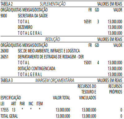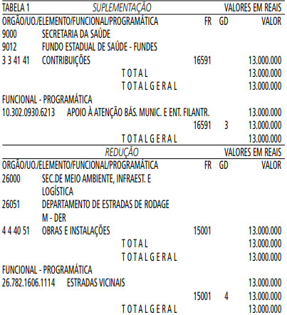 Artigo 1° - Fica aberto um crédito de R$ 13.000.000,00 (treze milhões de reais), suplementar ao orçamento da Secretaria da Saúde, observando-se as classificações Institucional, Econômica, Funcional e Programática, conforme a Tabela 1, anexa.