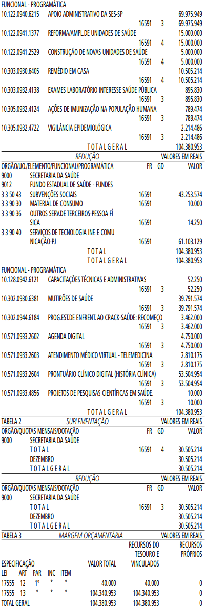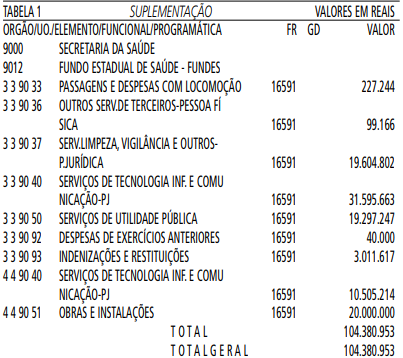 Artigo 1° - Fica aberto um crédito de R$ 104.380.953,00 (cento e quatro milhões, trezentos e oitenta mil, novecentos e cinquenta e três reais), suplementar ao orçamento da Secretaria da Saúde, observando-se as classificações Institucional, Econômica, Funcional e Programática, conforme a Tabela 1, anexa.