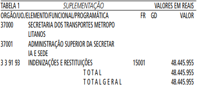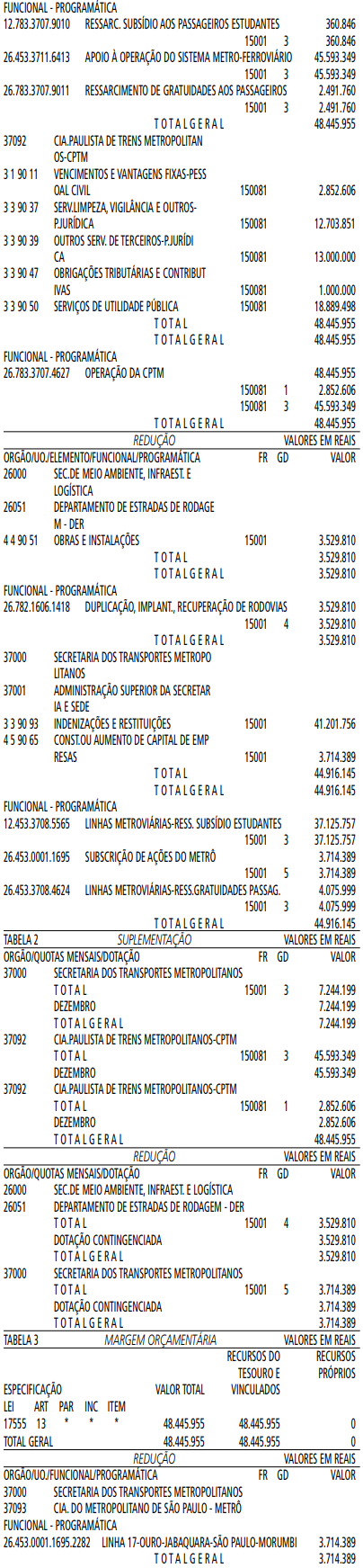 Artigo 1° - Fica aberto um crédito de R$ 48.445.955,00 (quarenta e oito milhões, quatrocentos e quarenta e cinco mil, novecentos e cinquenta e cinco reais), suplementar ao orçamento da Companhia Paulista de Trens Metropolitanos-CPTM, observando-se as classificações Institucional, Econômica, Funcional e Programática, conforme a Tabela 1, anexa.