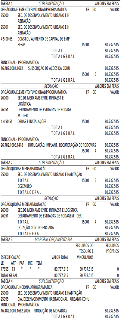 Artigo 1° - Fica aberto um crédito de R$ 80.737.515,00 (oitenta milhões, setecentos e trinta e sete mil, quinhentos e quinze reais), suplementar ao orçamento da Secretaria de Desenvolvimento Urbano e Habitação, observando-se as classificações Institucional, Econômica, Funcional e Programática, conforme a Tabela 1, anexa.