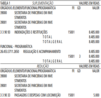 Artigo 1° - Fica aberto um crédito de R$ 8.485.000,00 (oito milhões, quatrocentos e oitenta e cinco mil reais), suplementar ao orçamento da Secretaria de Parcerias em Investimentos, observando-se as classificações Institucional, Econômica, Funcional e Programática, conforme a Tabela 1, anexa.